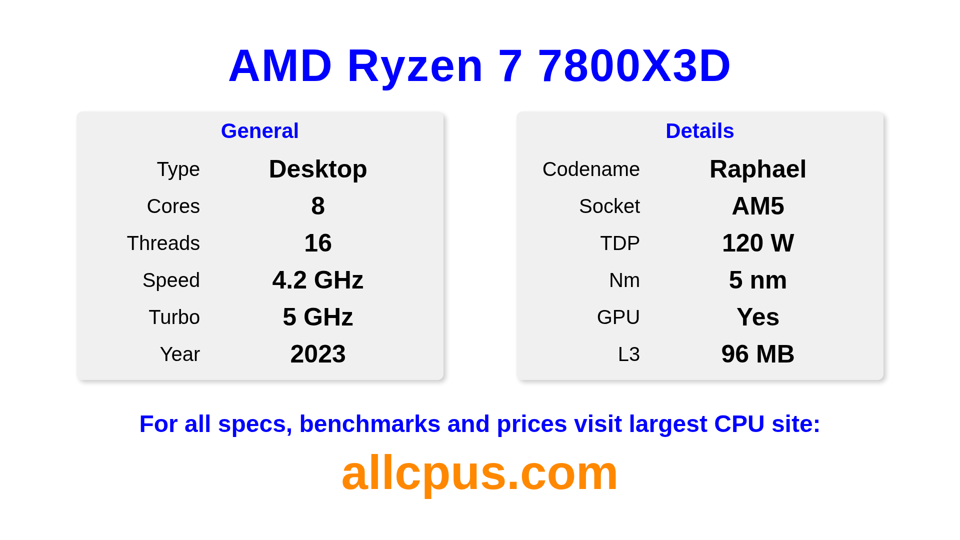 The AMD Ryzen 7 7800X3D is a AMD desktop processor from the Ryzen lineup, built on the Raphael architecture and released in 2023. This CPU features 8 cores, a base clock of 4200 MHz, maximum turbo frequency of 5000 MHz and 96 MB of L3 cache. Manufactured using 5 nm process technology. The AMD Ryzen 7 7800X3D is designed for the AM5 socket.It supports overclocking. It includes integrated AMD Radeon Graphics graphics.