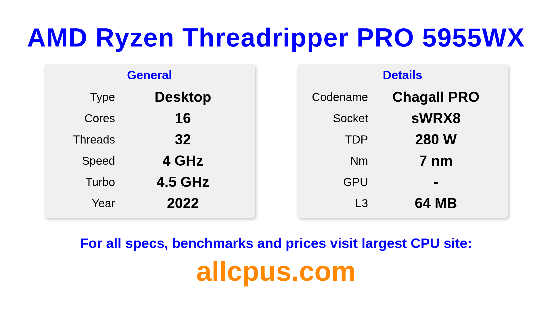 The AMD Ryzen Threadripper PRO 5955WX is a AMD desktop processor from the Ryzen Threadripper PRO lineup, built on the Chagall PRO architecture and released in 2022. This CPU features 16 cores, a base clock of 4000 MHz, maximum turbo frequency of 4500 MHz and 64 MB of L3 cache. Manufactured using 7 nm process technology. The AMD Ryzen Threadripper PRO 5955WX is designed for the sWRX8 socket.It supports overclocking. A dedicated graphics card is required.