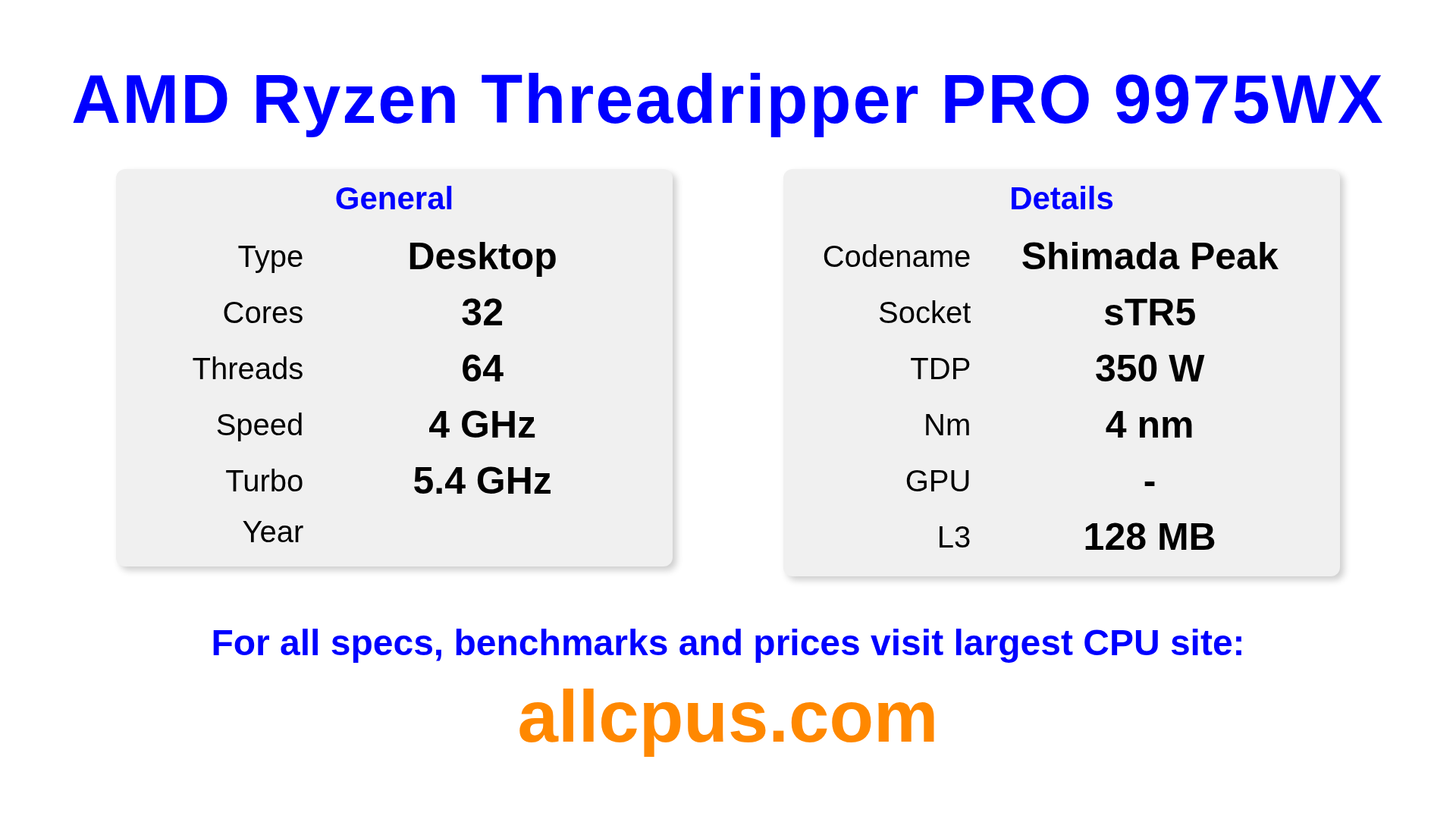 The AMD Ryzen Threadripper PRO 9975WX is a AMD desktop processor from the Ryzen Threadripper PRO lineup, built on the Shimada Peak architecture and released in . This CPU features 32 cores, a base clock of 4000 MHz, maximum turbo frequency of 5400 MHz and 128 MB of L3 cache. Manufactured using 4 nm process technology. The AMD Ryzen Threadripper PRO 9975WX is designed for the sTR5 socket.It supports overclocking. A dedicated graphics card is required.