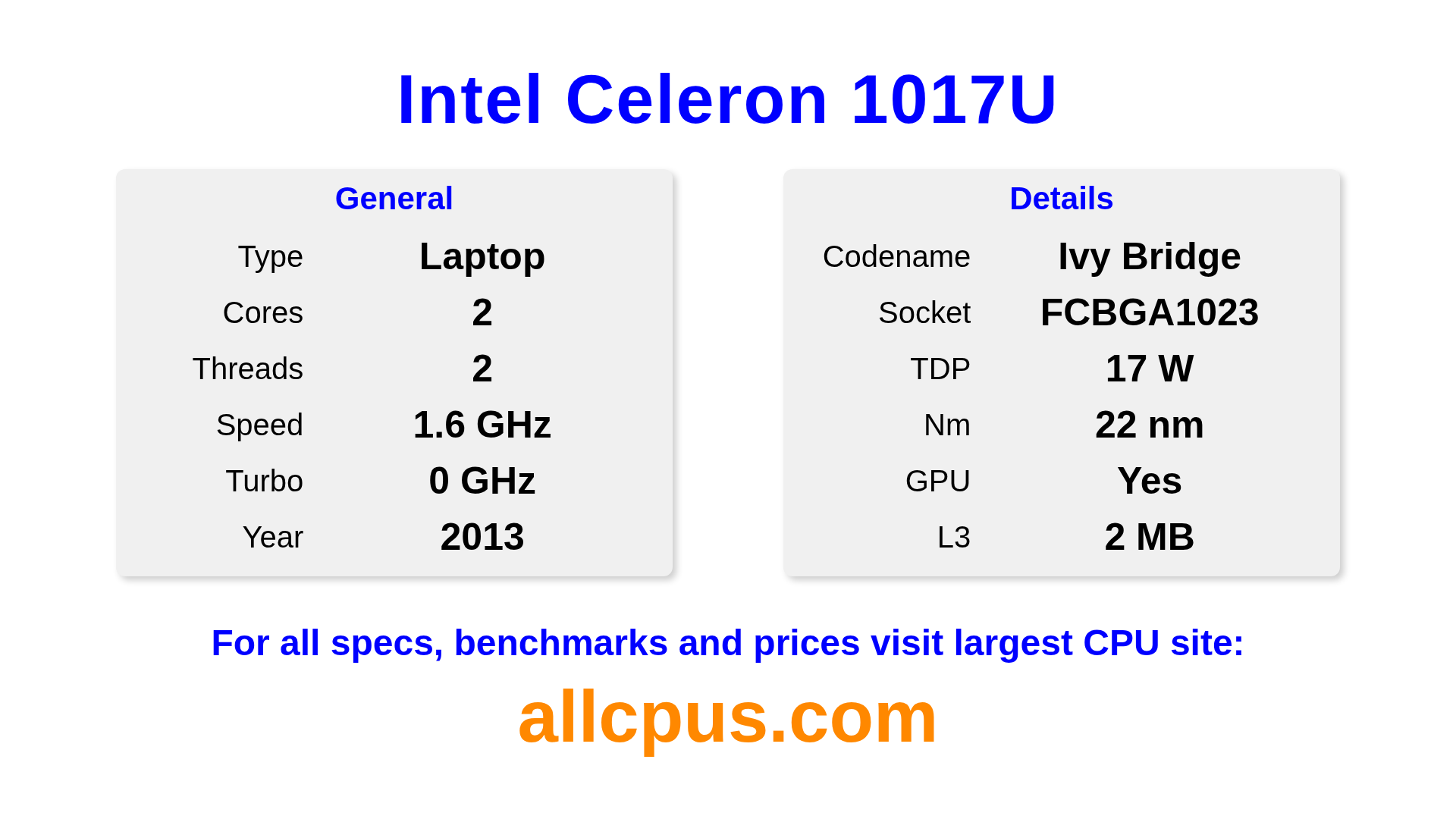 The Intel Celeron 1017U is a Intel laptop processor from the Intel® Celeron® lineup, built on the Ivy Bridge architecture and released in 2013. This CPU features 2 cores, a base clock of 1600 MHz, maximum turbo frequency of 0 MHz and 2 MB of L3 cache. Manufactured using 22 nm process technology. The Intel Celeron 1017U is designed for the BGA1023 socket. It includes integrated Intel® HD Graphics for 3rd Generation Intel® Processors graphics.