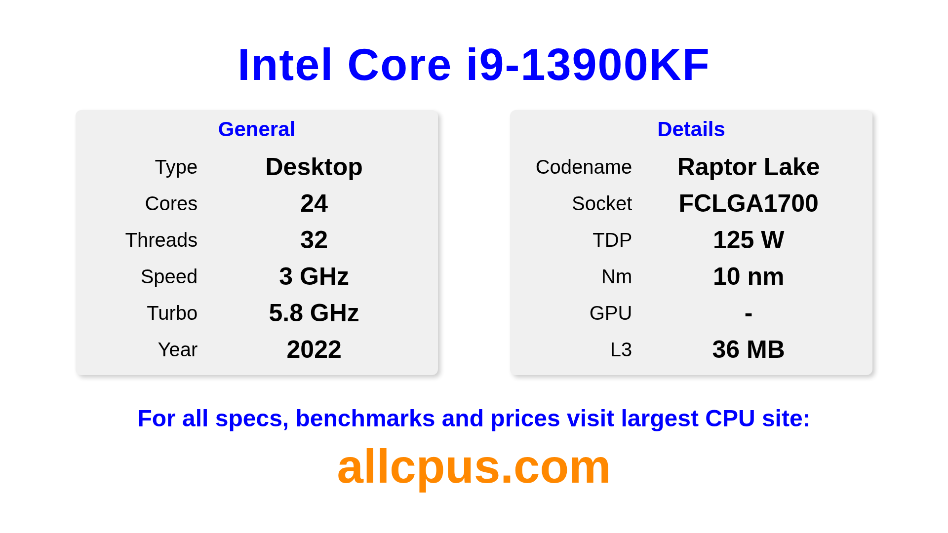 The Intel Core i9-13900KF is a Intel desktop processor from the Intel Core lineup, built on the Raptor Lake architecture and released in 2022. This CPU features 24 cores, a base clock of 3000 MHz, maximum turbo frequency of 5800 MHz and 36 MB of L3 cache. Manufactured using 10 nm process technology. The Intel Core i9-13900KF is designed for the LGA1700 socket. A dedicated graphics card is required.