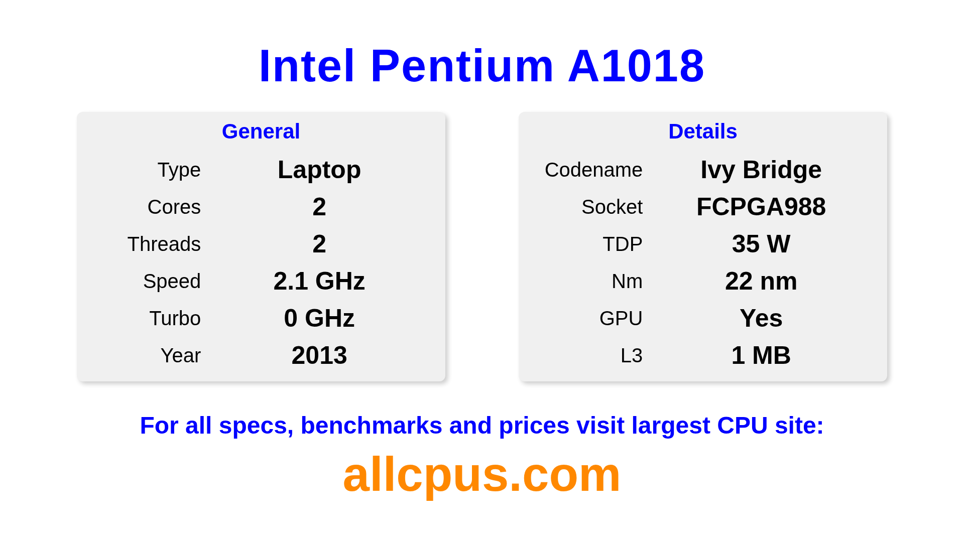 The Intel Pentium A1018 is a Intel laptop processor from the Intel® Pentium® lineup, built on the Ivy Bridge architecture and released in 2013. This CPU features 2 cores, a base clock of 2100 MHz, maximum turbo frequency of 0 MHz and 1 MB of L3 cache. Manufactured using 22 nm process technology. The Intel Pentium A1018 is designed for the PGA988 socket. It includes integrated Intel® HD Graphics for 3rd Generation Intel® Processors graphics.