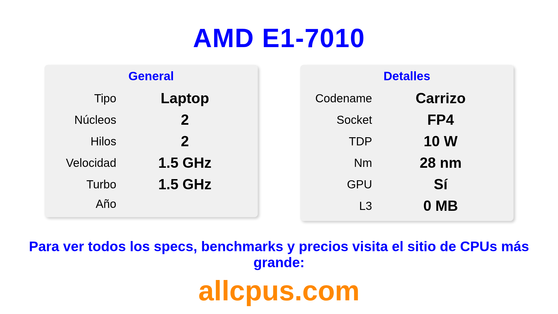 El AMD E1-7010 es un procesador portátil de AMD de la gama E-Series, basado en la arquitectura Carrizo y lanzado en . Esta CPU cuenta con 2 núcleos, una frecuencia base de 1500 MHz, una frecuencia turbo máxima de 1500 MHz y 0 MB de caché L3. Fabricado usando tecnología de proceso de 28 nm.El AMD E1-7010 está diseñado para el socket FP4. Incluye gráficos integrados AMD Radeon R2 Graphics.