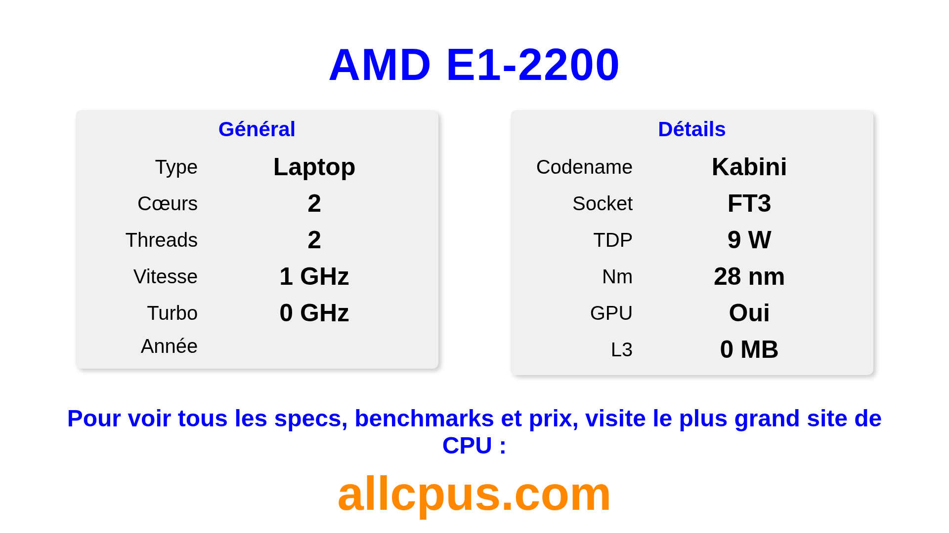 Le AMD E1-2200 est un AMD processeur portable de la gamme E-Series, basé sur l’architecture Kabini et sorti en . Ce CPU dispose de 2 cœurs, une fréquence de base de 1000 MHz, fréquence turbo max de 0 MHz et 0 Mo de cache L3. Fabriqué avec la technologie 28 nm. Le AMD E1-2200 est conçu pour le socket FT3. Il inclut les graphiques intégrés AMD Radeon HD 8210.