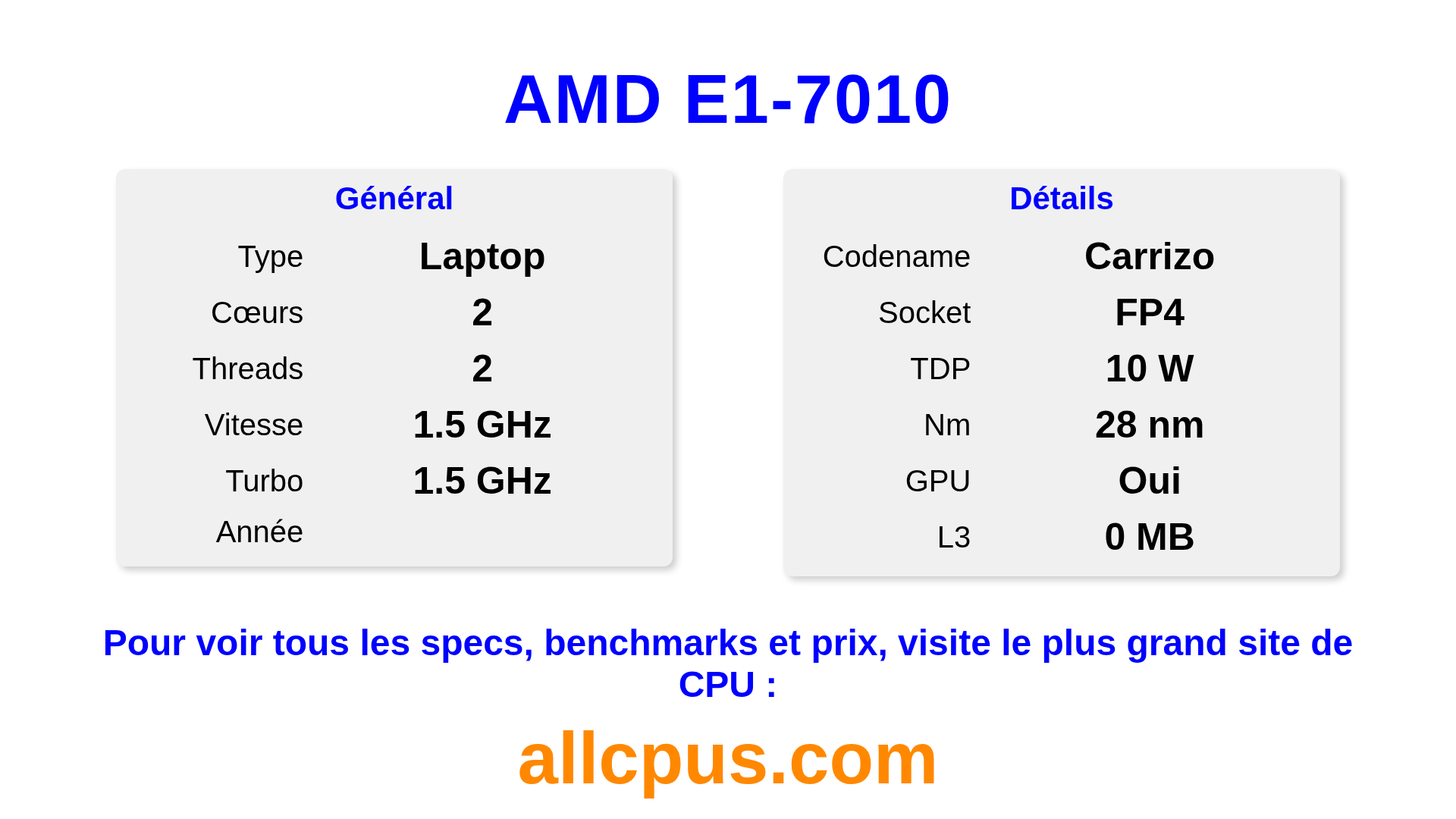 Le AMD E1-7010 est un AMD processeur portable de la gamme E-Series, basé sur l’architecture Carrizo et sorti en . Ce CPU dispose de 2 cœurs, une fréquence de base de 1500 MHz, fréquence turbo max de 1500 MHz et 0 Mo de cache L3. Fabriqué avec la technologie 28 nm. Le AMD E1-7010 est conçu pour le socket FP4. Il inclut les graphiques intégrés AMD Radeon R2 Graphics.