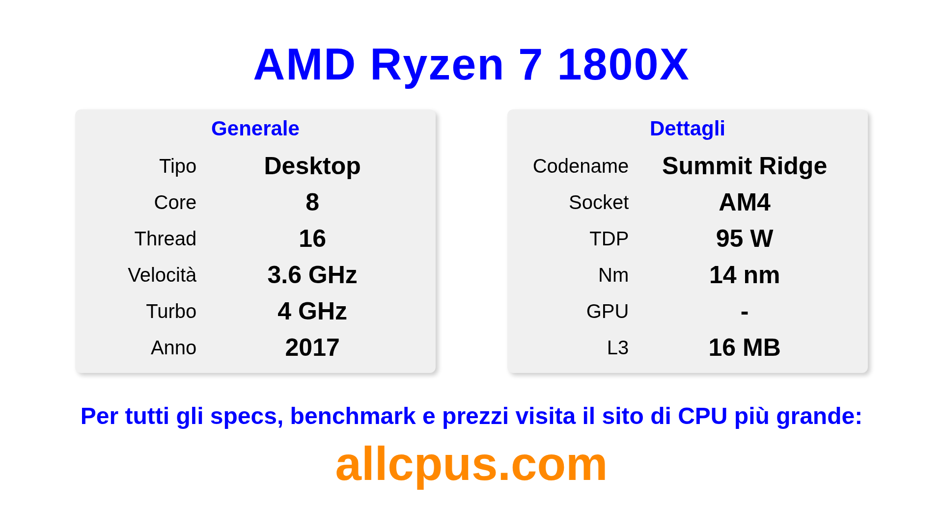 Il AMD Ryzen 7 1800X è un AMD processore desktop della linea Ryzen, costruito sull’architettura Summit Ridge e rilasciato nel 2017. Questa CPU ha 8 core, una frequenza base di 3600 MHz, frequenza turbo massima di 4000 MHz e 16 MB di cache L3. Prodotto usando tecnologia di processo a 14 nm.Il AMD Ryzen 7 1800X è progettato per il socket AM4.Supporta l’overclock. È necessaria una scheda grafica dedicata.