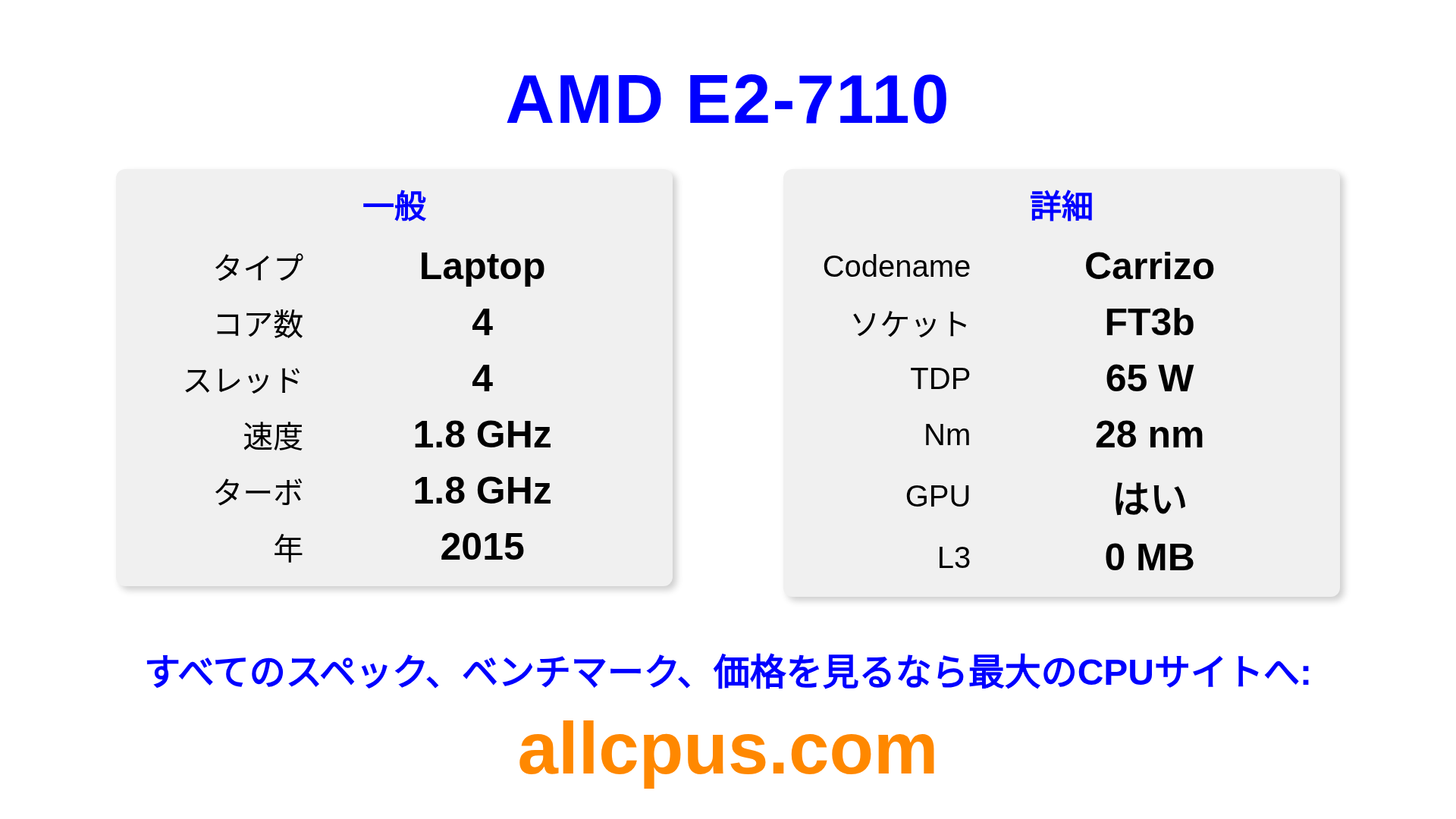 AMD E2-7110はAMDのE-SeriesラインアップのノートPC用プロセッサで、Carrizoアーキテクチャを基に2015にリリースされました。 このCPUは4コア、基本クロック1800 MHz、最大ターボ周波数1800 MHz、0 MBのL3キャッシュを搭載しています。 28 nmプロセス技術で製造されています。AMD E2-7110はFT3bソケット向けに設計されています。 統合AMD Radeon R2 Graphicsグラフィックスを搭載しています。