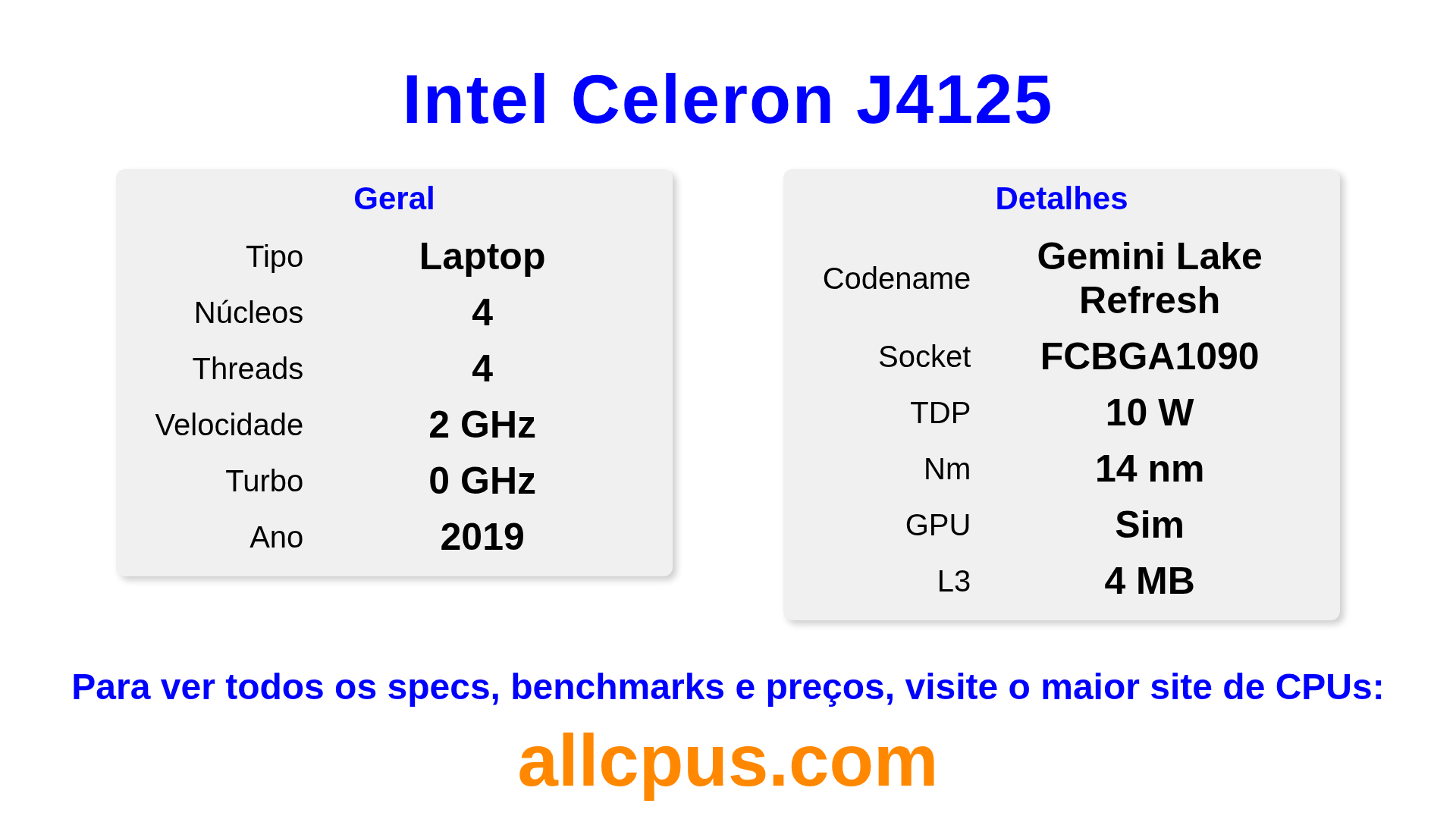 O Intel Celeron J4125 é um Intel processador de notebook da linha Intel® Celeron®, baseado na arquitetura Gemini Lake Refresh e lançado em 2019. Este CPU possui 4 núcleos, clock base de 2000 MHz, frequência turbo máxima de 0 MHz e 4 MB de cache L3. Fabricado usando tecnologia de processo de 14 nm.O Intel Celeron J4125 é projetado para o socket BGA1090. Inclui gráficos integrados Intel® UHD Graphics 600.