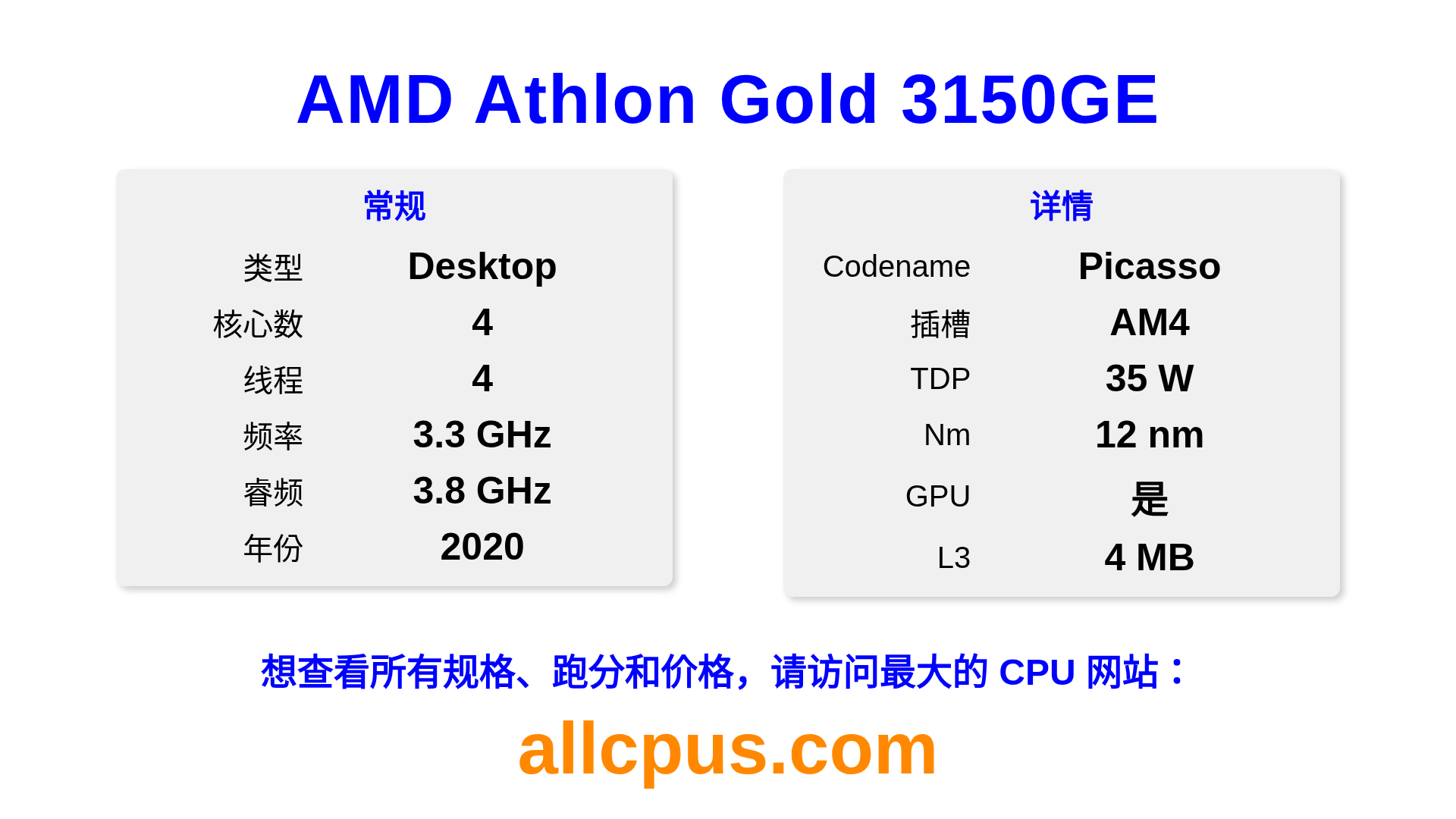 AMD Athlon Gold 3150GE 是 AMD Athlon 系列的 桌面处理器,基于 Picasso 架构,于 2020 发布。 这款 CPU 拥有 4 核心,基础频率为 3300 MHz,最高加速频率为 3800 MHz,L3 缓存为 4 MB。 使用 12 nm 工艺制造。AMD Athlon Gold 3150GE 设计用于 AM4 插槽。支持超频。 包括集成的 Radeon Graphics 显卡。
