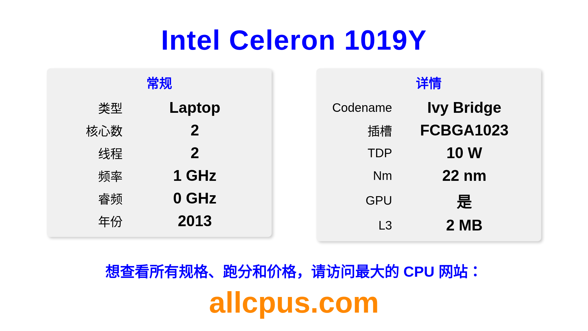 Intel Celeron 1019Y 是 Intel Intel® Celeron® 系列的 笔记本处理器,基于 Ivy Bridge 架构,于 2013 发布。 这款 CPU 拥有 2 核心,基础频率为 1000 MHz,最高加速频率为 0 MHz,L3 缓存为 2 MB。 使用 22 nm 工艺制造。Intel Celeron 1019Y 设计用于 BGA1023 插槽。 包括集成的 Intel® HD Graphics for 3rd Generation Intel® Processors 显卡。