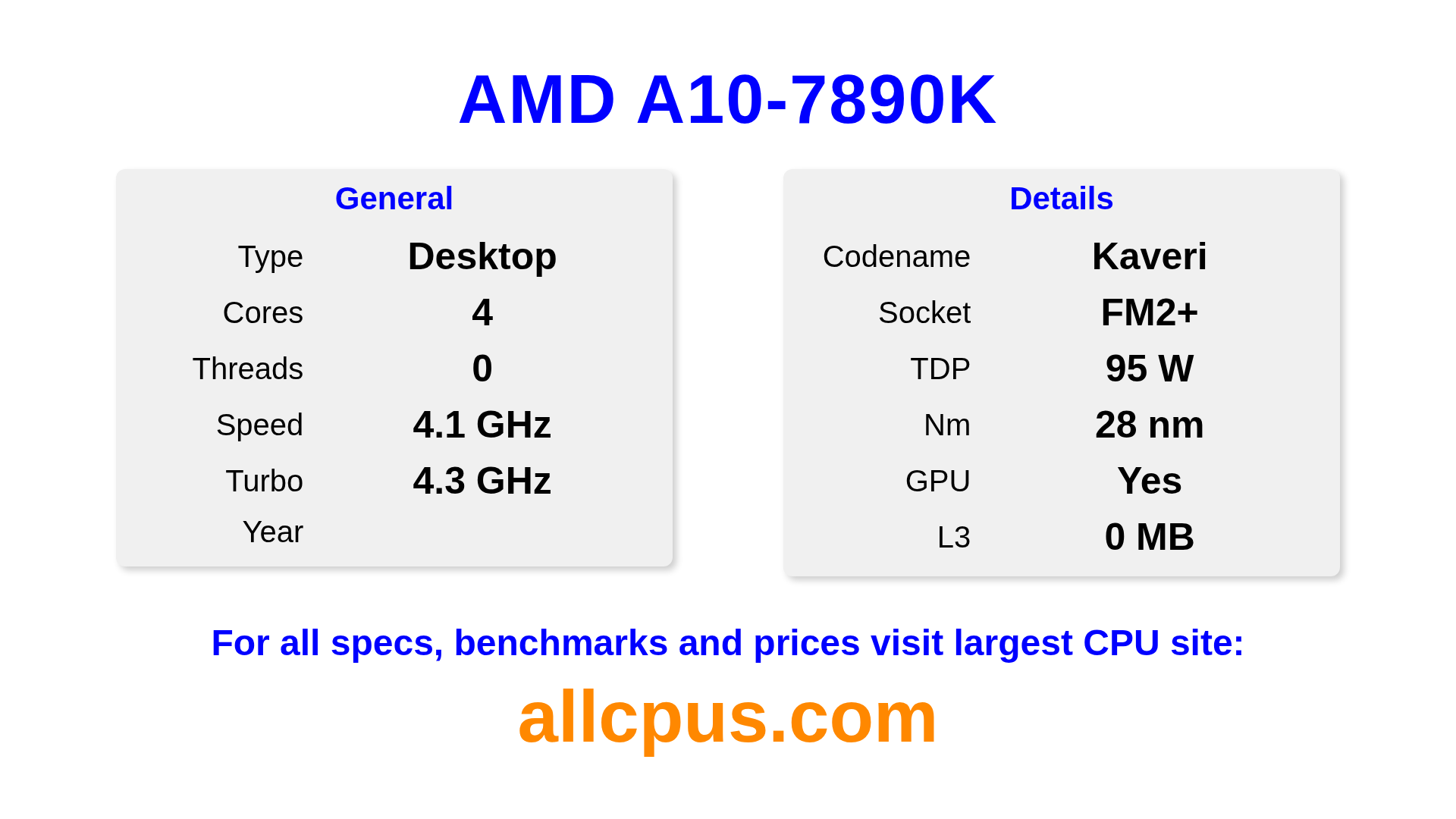 The AMD A10-7890K is a AMD desktop processor from the A-Series lineup, built on the Kaveri architecture and released in . This CPU features 4 cores, a base clock of 4100 MHz, maximum turbo frequency of 4300 MHz and 0 MB of L3 cache. Manufactured using 28 nm process technology. The AMD A10-7890K is designed for the FM2+ socket.It supports overclocking. It includes integrated AMD Radeon R7 Graphics graphics.