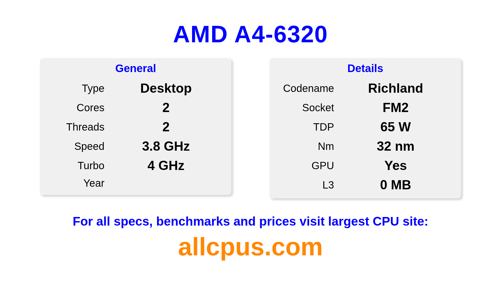 The AMD A4-6320 is a AMD desktop processor from the A-Series lineup, built on the Richland architecture and released in . This CPU features 2 cores, a base clock of 3800 MHz, maximum turbo frequency of 4000 MHz and 0 MB of L3 cache. Manufactured using 32 nm process technology. The AMD A4-6320 is designed for the FM2 socket. It includes integrated AMD Radeon HD 8370D graphics.