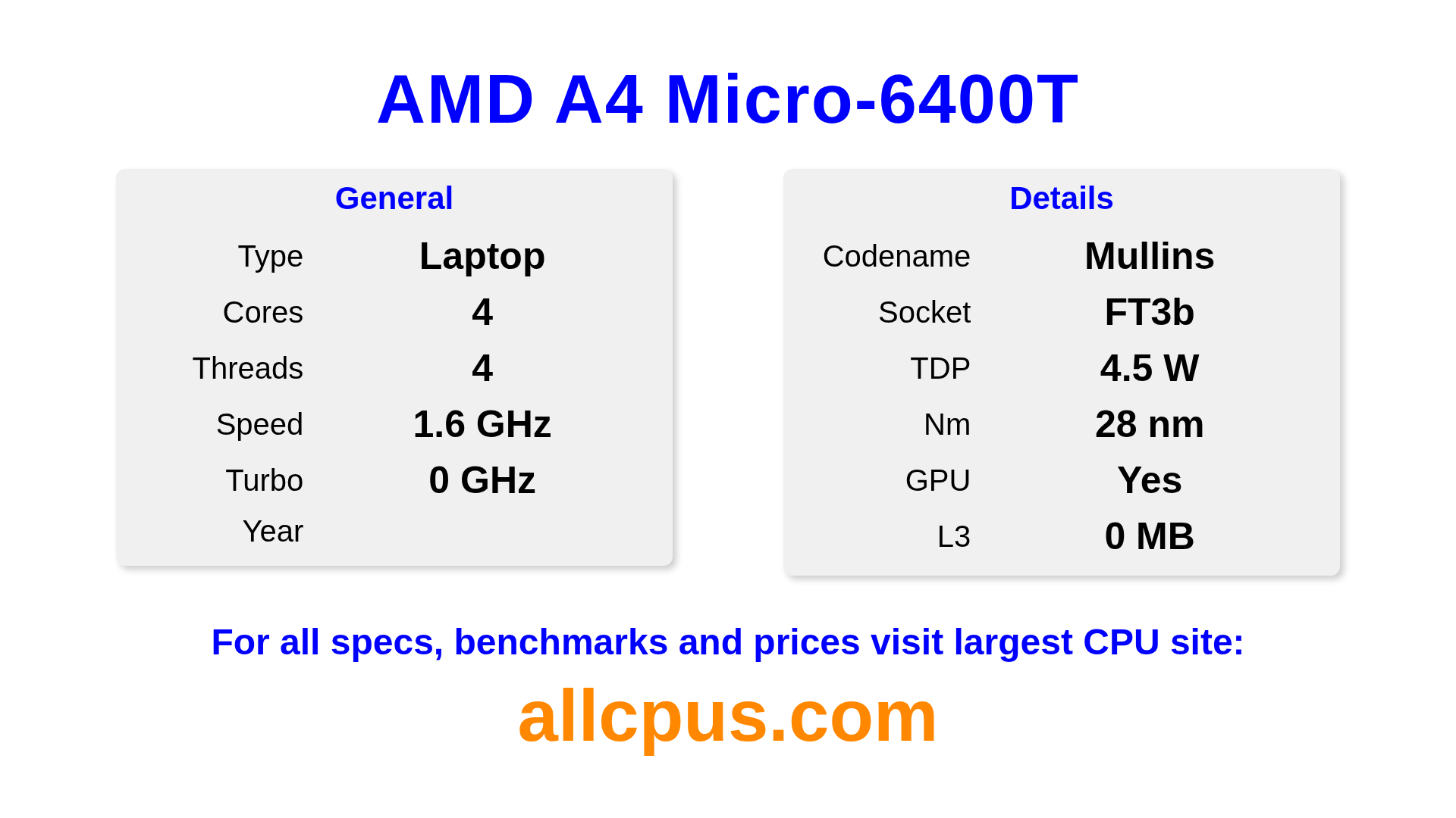 The AMD A4 Micro-6400T is a AMD laptop processor from the A-Series lineup, built on the Mullins architecture and released in . This CPU features 4 cores, a base clock of 1600 MHz, maximum turbo frequency of 0 MHz and 0 MB of L3 cache. Manufactured using 28 nm process technology. The AMD A4 Micro-6400T is designed for the FT3b socket. It includes integrated AMD Radeon R3 Graphics graphics.