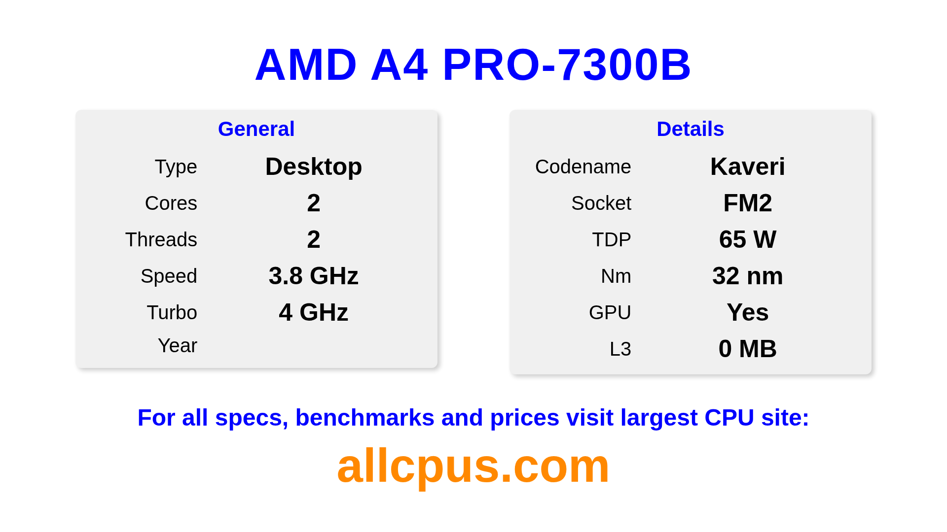 The AMD A4 PRO-7300B is a AMD desktop processor from the PRO A-Series lineup, built on the Kaveri architecture and released in . This CPU features 2 cores, a base clock of 3800 MHz, maximum turbo frequency of 4000 MHz and 0 MB of L3 cache. Manufactured using 32 nm process technology. The AMD A4 PRO-7300B is designed for the FM2 socket. It includes integrated AMD Radeon HD 8470D graphics.