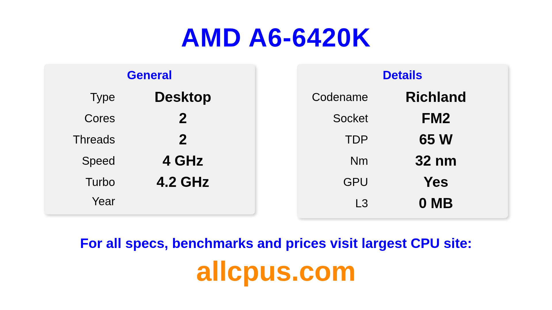 The AMD A6-6420K is a AMD desktop processor from the A-Series lineup, built on the Richland architecture and released in . This CPU features 2 cores, a base clock of 4000 MHz, maximum turbo frequency of 4200 MHz and 0 MB of L3 cache. Manufactured using 32 nm process technology. The AMD A6-6420K is designed for the FM2 socket.It supports overclocking. It includes integrated AMD Radeon HD 8470D graphics.