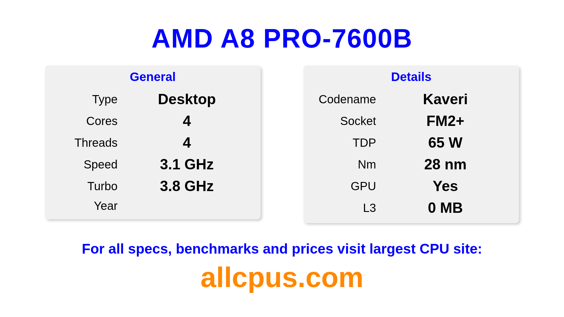 The AMD A8 PRO-7600B is a AMD desktop processor from the PRO A-Series lineup, built on the Kaveri architecture and released in . This CPU features 4 cores, a base clock of 3100 MHz, maximum turbo frequency of 3800 MHz and 0 MB of L3 cache. Manufactured using 28 nm process technology. The AMD A8 PRO-7600B is designed for the FM2+ socket. It includes integrated AMD Radeon R7 Graphics graphics.