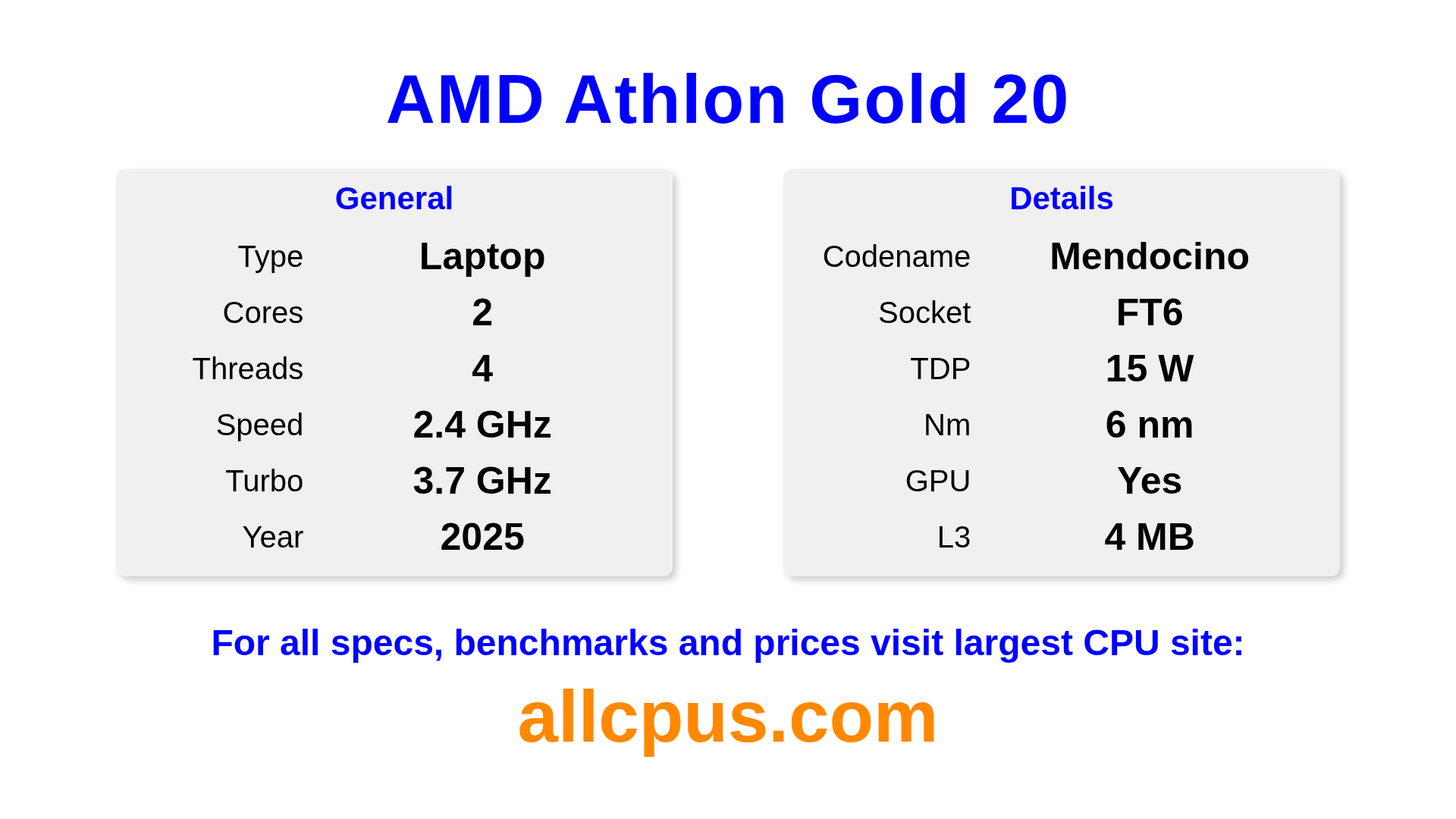 The AMD Athlon Gold 20 is a AMD laptop processor from the Athlon lineup, built on the Mendocino architecture and released in 2025. This CPU features 2 cores, a base clock of 2400 MHz, maximum turbo frequency of 3700 MHz and 4 MB of L3 cache. Manufactured using 6 nm process technology. The AMD Athlon Gold 20 is designed for the FT6 socket. It includes integrated AMD Radeon 610M graphics.