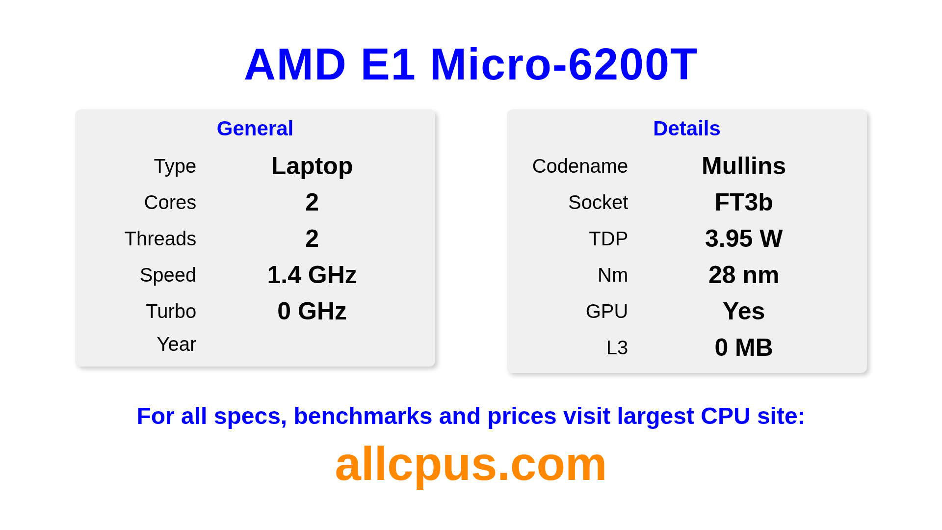 The AMD E1 Micro-6200T is a AMD laptop processor from the E-Series lineup, built on the Mullins architecture and released in . This CPU features 2 cores, a base clock of 1400 MHz, maximum turbo frequency of 0 MHz and 0 MB of L3 cache. Manufactured using 28 nm process technology. The AMD E1 Micro-6200T is designed for the FT3b socket. It includes integrated AMD Radeon R2 Graphics graphics.