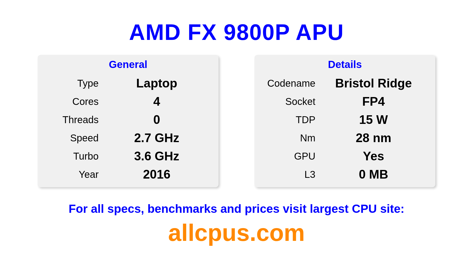 The AMD FX 9800P APU is a AMD laptop processor from the FX-Series lineup, built on the Bristol Ridge architecture and released in 2016. This CPU features 4 cores, a base clock of 2700 MHz, maximum turbo frequency of 3600 MHz and 0 MB of L3 cache. Manufactured using 28 nm process technology. The AMD FX 9800P APU is designed for the FP4 socket. It includes integrated AMD Radeon R7 Graphics graphics.