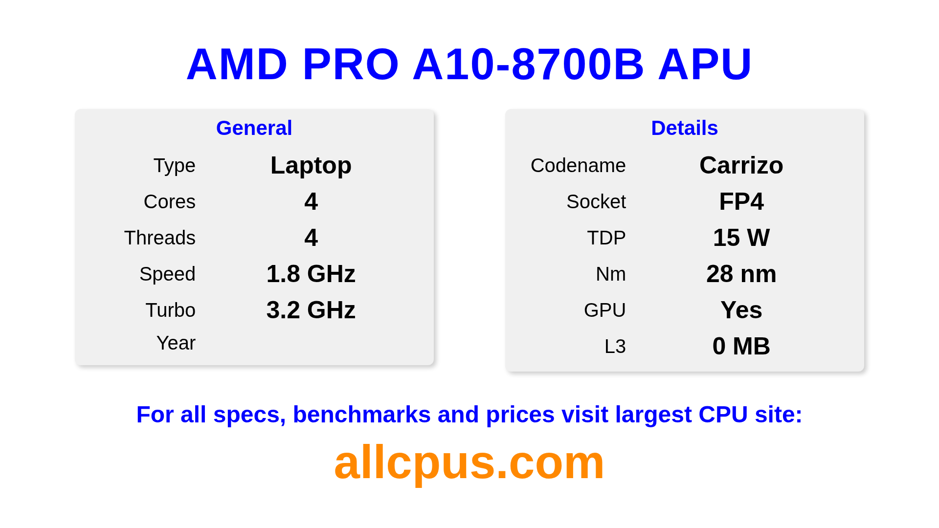 The AMD PRO A10-8700B APU is a AMD laptop processor from the PRO A-Series lineup, built on the Carrizo architecture and released in . This CPU features 4 cores, a base clock of 1800 MHz, maximum turbo frequency of 3200 MHz and 0 MB of L3 cache. Manufactured using 28 nm process technology. The AMD PRO A10-8700B APU is designed for the FP4 socket. It includes integrated AMD Radeon R6 Graphics graphics.