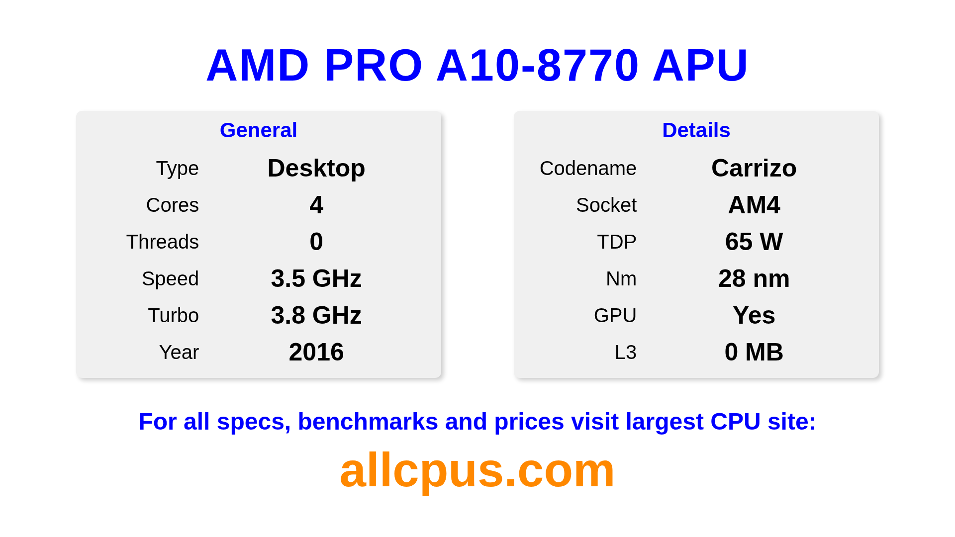 The AMD PRO A10-8770 APU is a AMD desktop processor from the PRO A-Series lineup, built on the Carrizo architecture and released in 2016. This CPU features 4 cores, a base clock of 3500 MHz, maximum turbo frequency of 3800 MHz and 0 MB of L3 cache. Manufactured using 28 nm process technology. The AMD PRO A10-8770 APU is designed for the AM4 socket. It includes integrated R7 graphics.