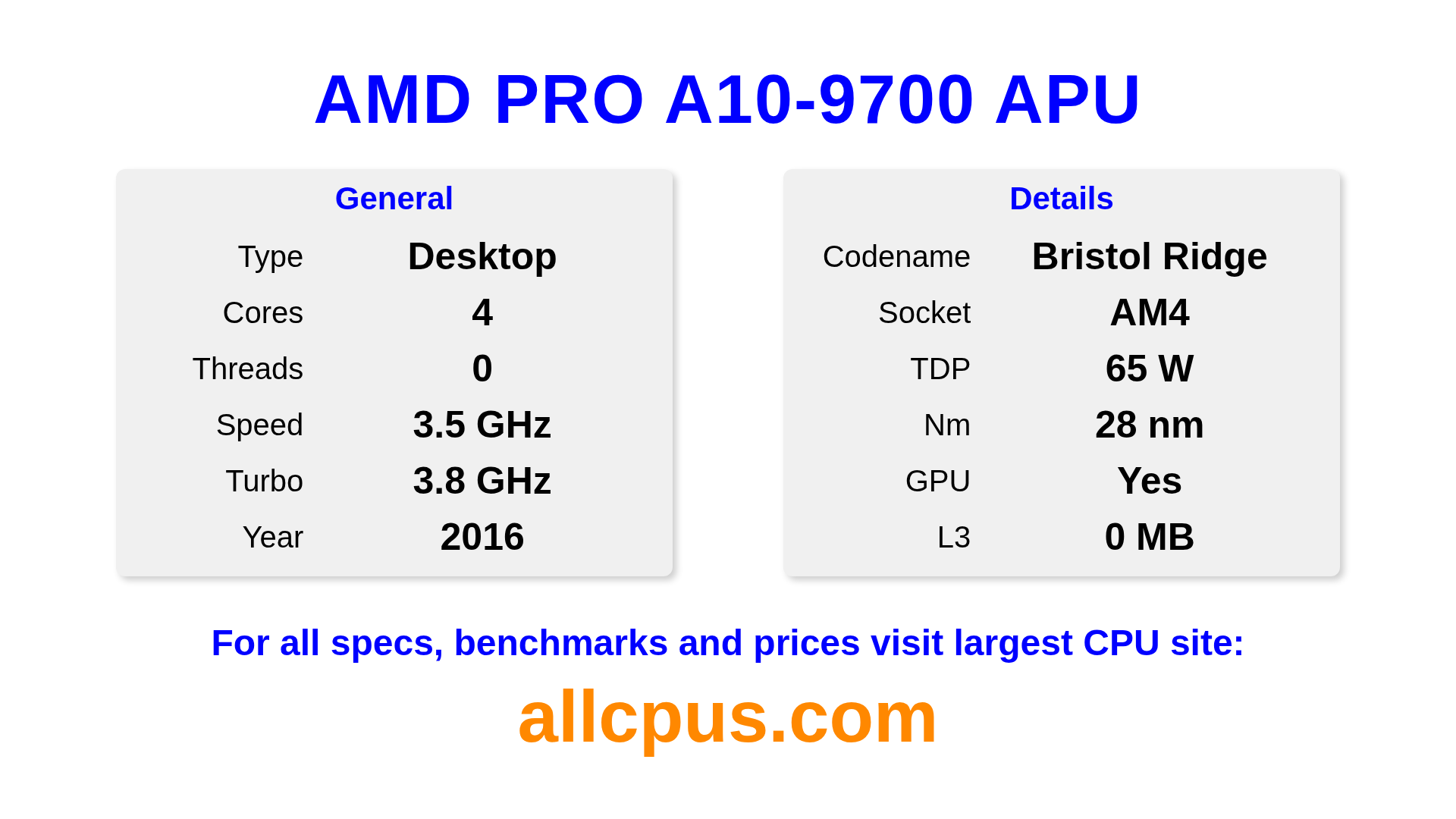 The AMD PRO A10-9700 APU is a AMD desktop processor from the PRO A-Series lineup, built on the Bristol Ridge architecture and released in 2016. This CPU features 4 cores, a base clock of 3500 MHz, maximum turbo frequency of 3800 MHz and 0 MB of L3 cache. Manufactured using 28 nm process technology. The AMD PRO A10-9700 APU is designed for the AM4 socket. It includes integrated R7 graphics.