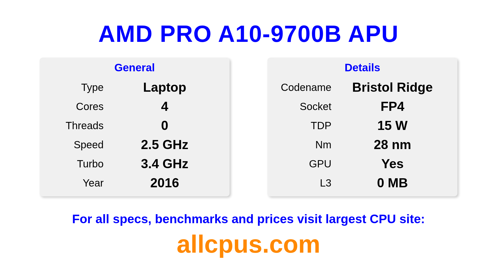The AMD PRO A10-9700B APU is a AMD laptop processor from the PRO A-Series lineup, built on the Bristol Ridge architecture and released in 2016. This CPU features 4 cores, a base clock of 2500 MHz, maximum turbo frequency of 3400 MHz and 0 MB of L3 cache. Manufactured using 28 nm process technology. The AMD PRO A10-9700B APU is designed for the FP4 socket. It includes integrated R7 graphics.