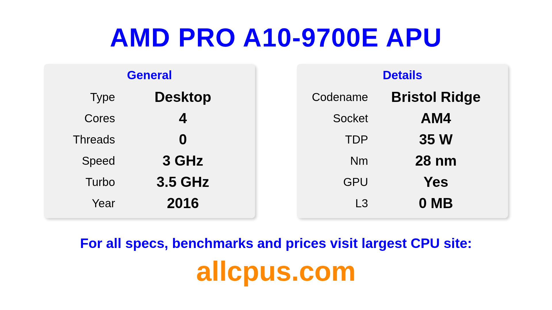 The AMD PRO A10-9700E APU is a AMD desktop processor from the PRO A-Series lineup, built on the Bristol Ridge architecture and released in 2016. This CPU features 4 cores, a base clock of 3000 MHz, maximum turbo frequency of 3500 MHz and 0 MB of L3 cache. Manufactured using 28 nm process technology. The AMD PRO A10-9700E APU is designed for the AM4 socket. It includes integrated R7 graphics.