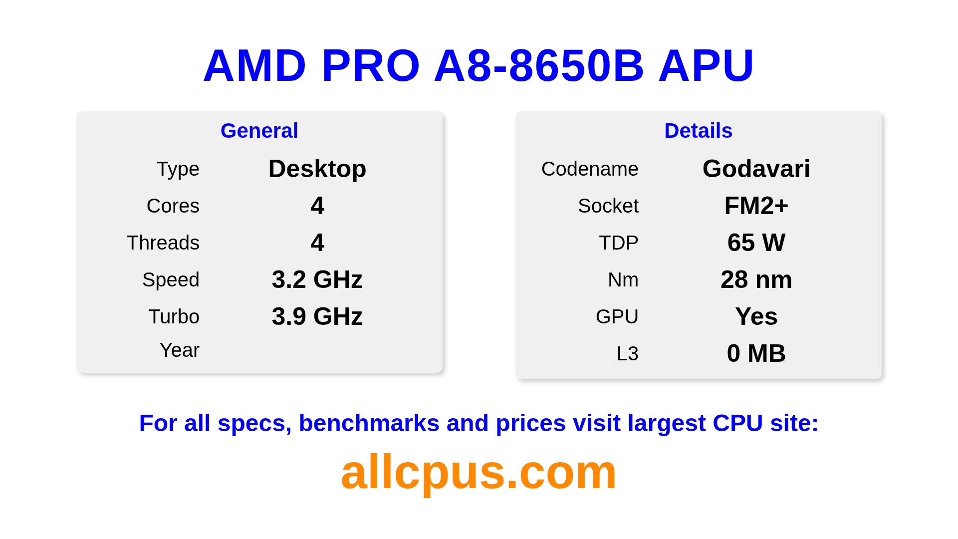 The AMD PRO A8-8650B APU is a AMD desktop processor from the PRO A-Series lineup, built on the Godavari architecture and released in . This CPU features 4 cores, a base clock of 3200 MHz, maximum turbo frequency of 3900 MHz and 0 MB of L3 cache. Manufactured using 28 nm process technology. The AMD PRO A8-8650B APU is designed for the FM2+ socket. It includes integrated AMD Radeon R7 Graphics graphics.