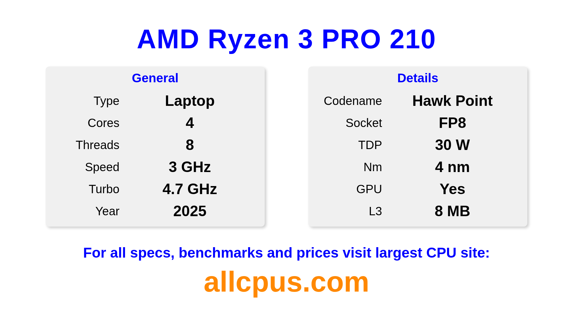 The AMD Ryzen 3 PRO 210 is a AMD laptop processor from the Ryzen PRO lineup, built on the Hawk Point architecture and released in 2025. This CPU features 4 cores, a base clock of 3000 MHz, maximum turbo frequency of 4700 MHz and 8 MB of L3 cache. Manufactured using 4 nm process technology. The AMD Ryzen 3 PRO 210 is designed for the FP8 socket. It includes integrated AMD Radeon 740M graphics.