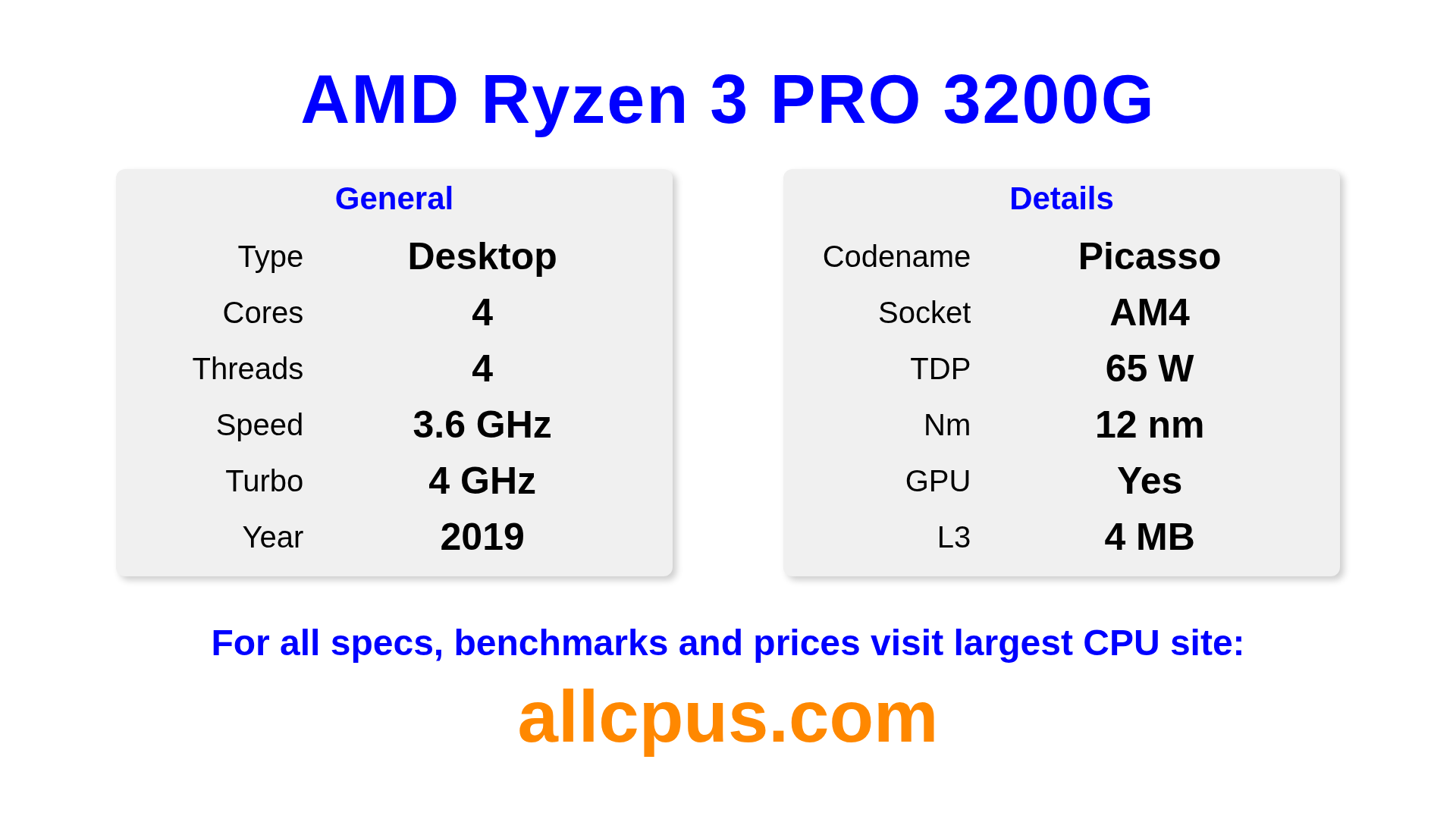 The AMD Ryzen 3 PRO 3200G is a AMD desktop processor from the Ryzen PRO lineup, built on the Picasso architecture and released in 2019. This CPU features 4 cores, a base clock of 3600 MHz, maximum turbo frequency of 4000 MHz and 4 MB of L3 cache. Manufactured using 12 nm process technology. The AMD Ryzen 3 PRO 3200G is designed for the AM4 socket. It includes integrated Radeon Vega 8 Graphics graphics.
