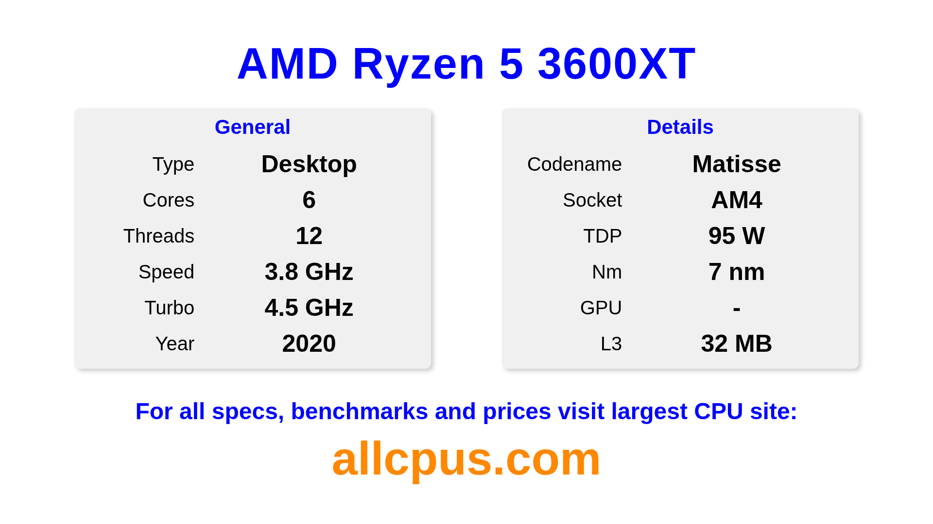 The AMD Ryzen 5 3600XT is a AMD desktop processor from the Ryzen lineup, built on the Matisse architecture and released in 2020. This CPU features 6 cores, a base clock of 3800 MHz, maximum turbo frequency of 4500 MHz and 32 MB of L3 cache. Manufactured using 7 nm process technology. The AMD Ryzen 5 3600XT is designed for the AM4 socket.It supports overclocking. A dedicated graphics card is required.
