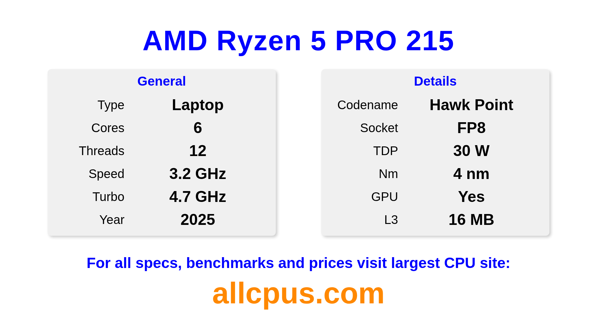 The AMD Ryzen 5 PRO 215 is a AMD laptop processor from the Ryzen PRO lineup, built on the Hawk Point architecture and released in 2025. This CPU features 6 cores, a base clock of 3200 MHz, maximum turbo frequency of 4700 MHz and 16 MB of L3 cache. Manufactured using 4 nm process technology. The AMD Ryzen 5 PRO 215 is designed for the FP8 socket. It includes integrated AMD Radeon 740M graphics.
