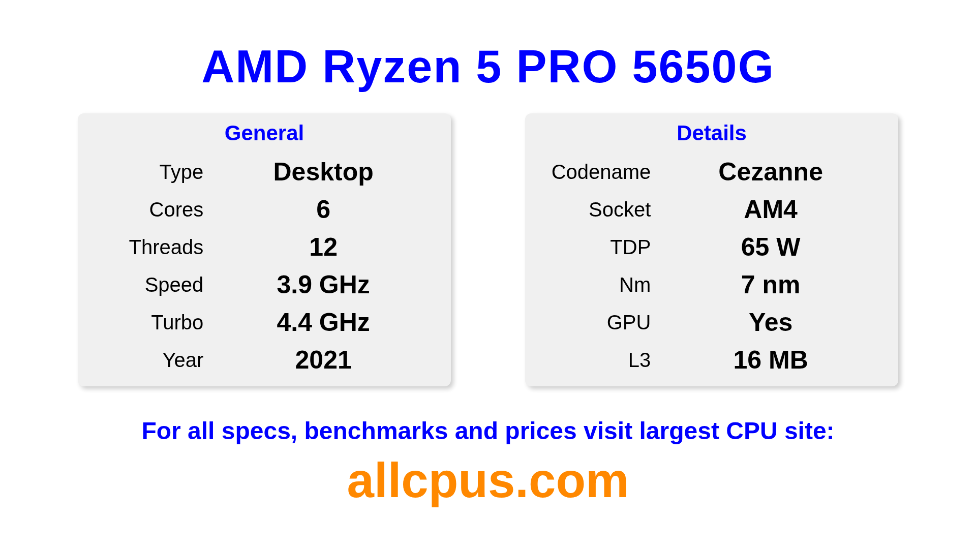 The AMD Ryzen 5 PRO 5650G is a AMD desktop processor from the Ryzen PRO lineup, built on the Cezanne architecture and released in 2021. This CPU features 6 cores, a base clock of 3900 MHz, maximum turbo frequency of 4400 MHz and 16 MB of L3 cache. Manufactured using 7 nm process technology. The AMD Ryzen 5 PRO 5650G is designed for the AM4 socket. It includes integrated Radeon Graphics graphics.