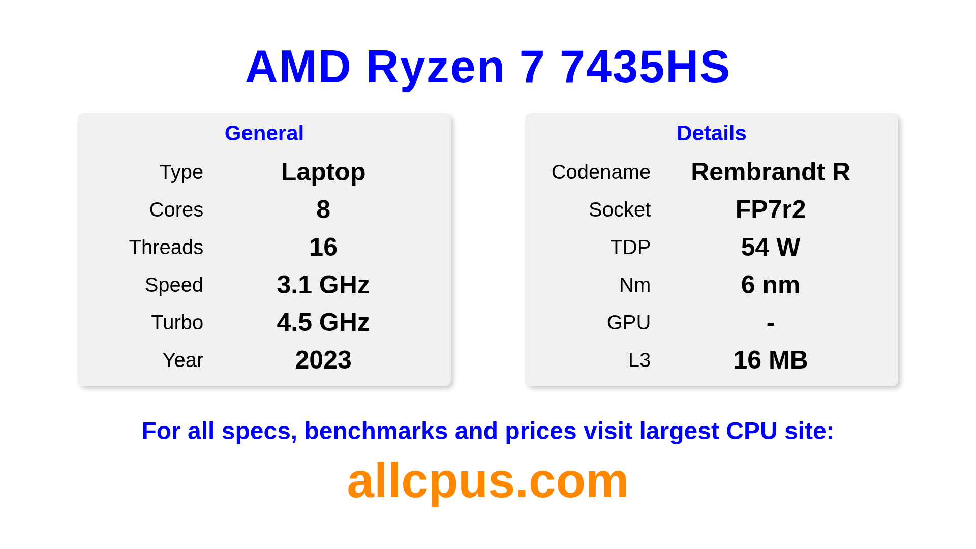 The AMD Ryzen 7 7435HS is a AMD laptop processor from the Ryzen lineup, built on the Rembrandt R architecture and released in 2023. This CPU features 8 cores, a base clock of 3100 MHz, maximum turbo frequency of 4500 MHz and 16 MB of L3 cache. Manufactured using 6 nm process technology. The AMD Ryzen 7 7435HS is designed for the FP7r2 socket. A dedicated graphics card is required.
