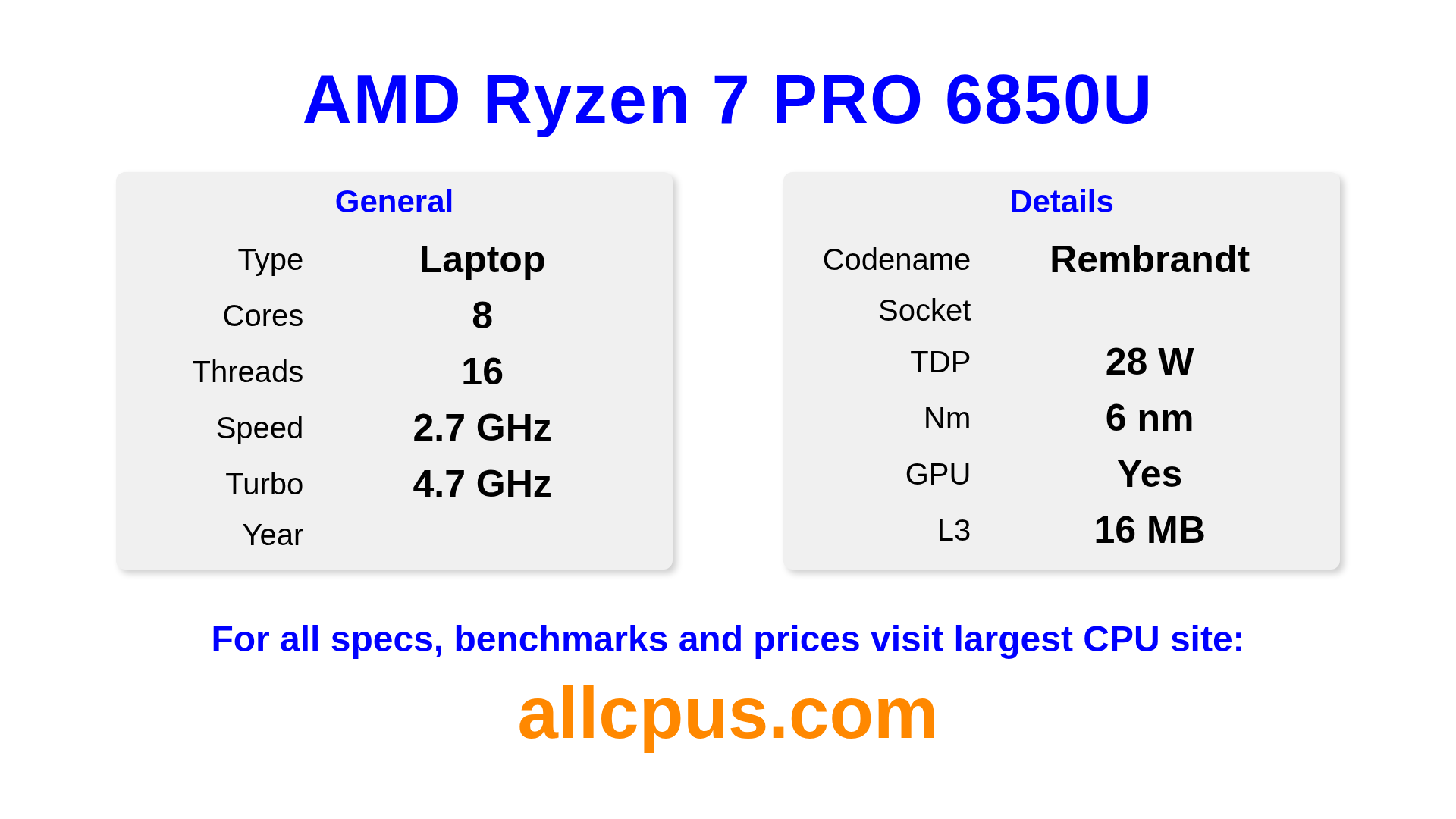 The AMD Ryzen 7 PRO 6850U is a AMD laptop processor from the Ryzen PRO lineup, built on the Rembrandt architecture and released in . This CPU features 8 cores, a base clock of 2700 MHz, maximum turbo frequency of 4700 MHz and 16 MB of L3 cache. Manufactured using 6 nm process technology. The AMD Ryzen 7 PRO 6850U is designed for the socket. It includes integrated AMD Radeon 680M graphics.