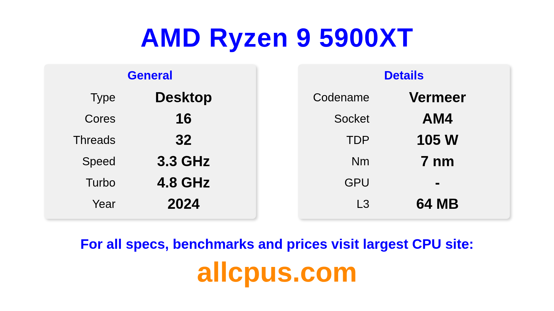 The AMD Ryzen 9 5900XT is a AMD desktop processor from the Ryzen lineup, built on the Vermeer architecture and released in 2024. This CPU features 16 cores, a base clock of 3300 MHz, maximum turbo frequency of 4800 MHz and 64 MB of L3 cache. Manufactured using 7 nm process technology. The AMD Ryzen 9 5900XT is designed for the AM4 socket.It supports overclocking. A dedicated graphics card is required.