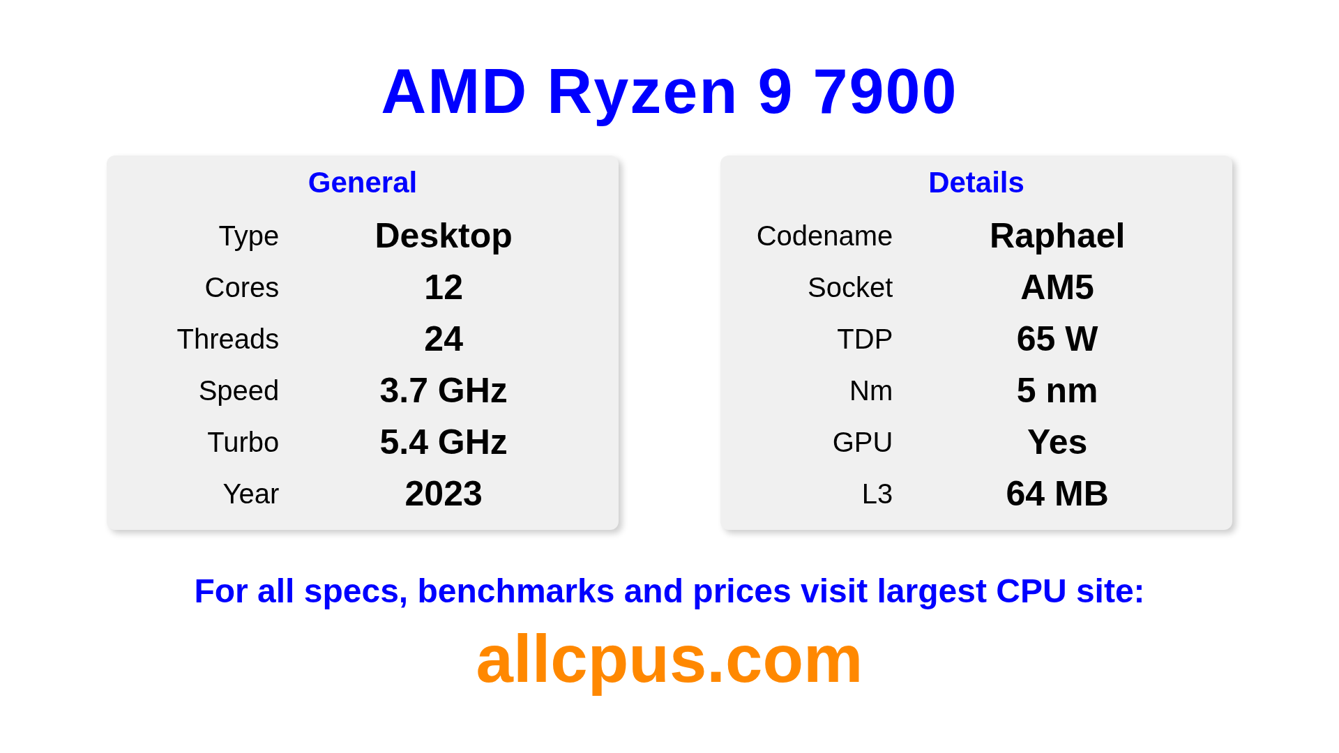 The AMD Ryzen 9 7900 is a AMD desktop processor from the Ryzen lineup, built on the Raphael architecture and released in 2023. This CPU features 12 cores, a base clock of 3700 MHz, maximum turbo frequency of 5400 MHz and 64 MB of L3 cache. Manufactured using 5 nm process technology. The AMD Ryzen 9 7900 is designed for the AM5 socket.It supports overclocking. It includes integrated AMD Radeon Graphics graphics.