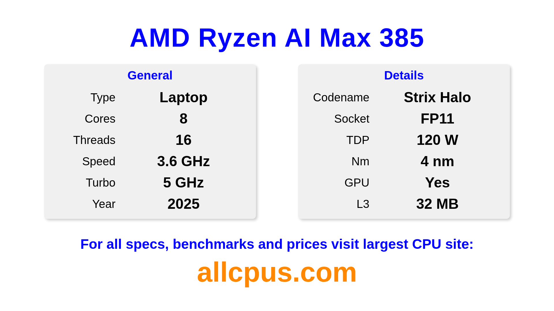 The AMD Ryzen AI Max 385 is a AMD laptop processor from the Ryzen lineup, built on the Strix Halo architecture and released in 2025. This CPU features 8 cores, a base clock of 3600 MHz, maximum turbo frequency of 5000 MHz and 32 MB of L3 cache. Manufactured using 4 nm process technology. The AMD Ryzen AI Max 385 is designed for the FP11 socket.It supports overclocking. It includes integrated Radeon 8050S Graphics graphics.
