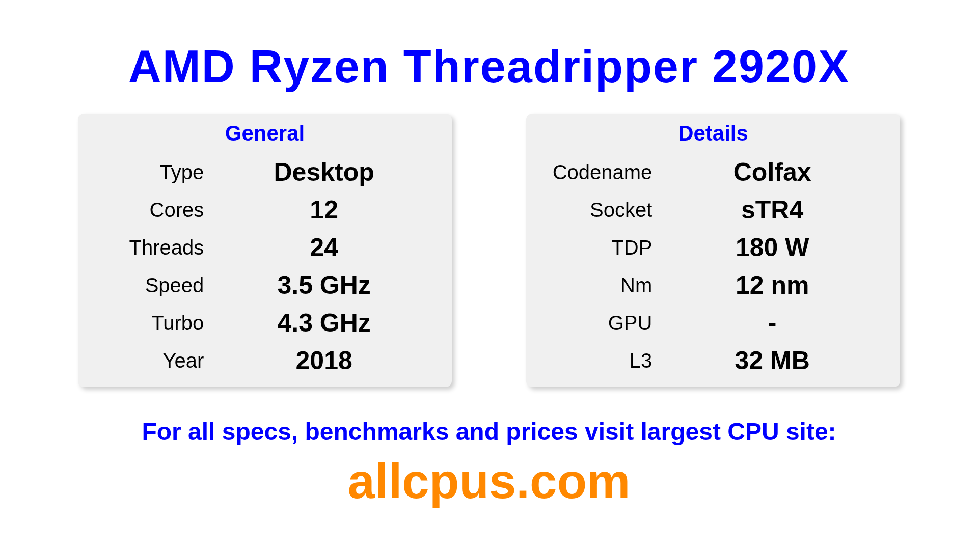 The AMD Ryzen Threadripper 2920X is a AMD desktop processor from the Ryzen Threadripper lineup, built on the Colfax architecture and released in 2018. This CPU features 12 cores, a base clock of 3500 MHz, maximum turbo frequency of 4300 MHz and 32 MB of L3 cache. Manufactured using 12 nm process technology. The AMD Ryzen Threadripper 2920X is designed for the sTR4 socket.It supports overclocking. A dedicated graphics card is required.