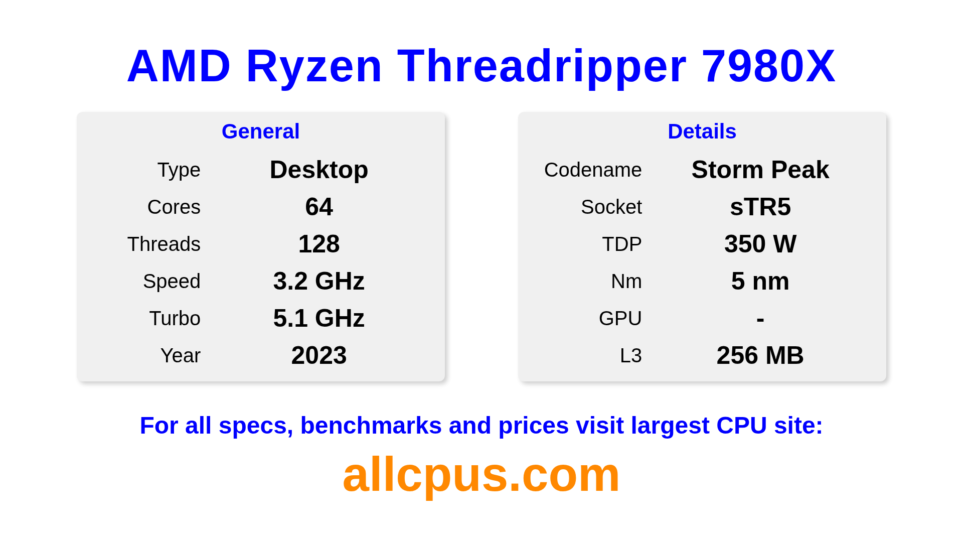 The AMD Ryzen Threadripper 7980X is a AMD desktop processor from the Ryzen Threadripper lineup, built on the Storm Peak architecture and released in 2023. This CPU features 64 cores, a base clock of 3200 MHz, maximum turbo frequency of 5100 MHz and 256 MB of L3 cache. Manufactured using 5 nm process technology. The AMD Ryzen Threadripper 7980X is designed for the sTR5 socket.It supports overclocking. A dedicated graphics card is required.