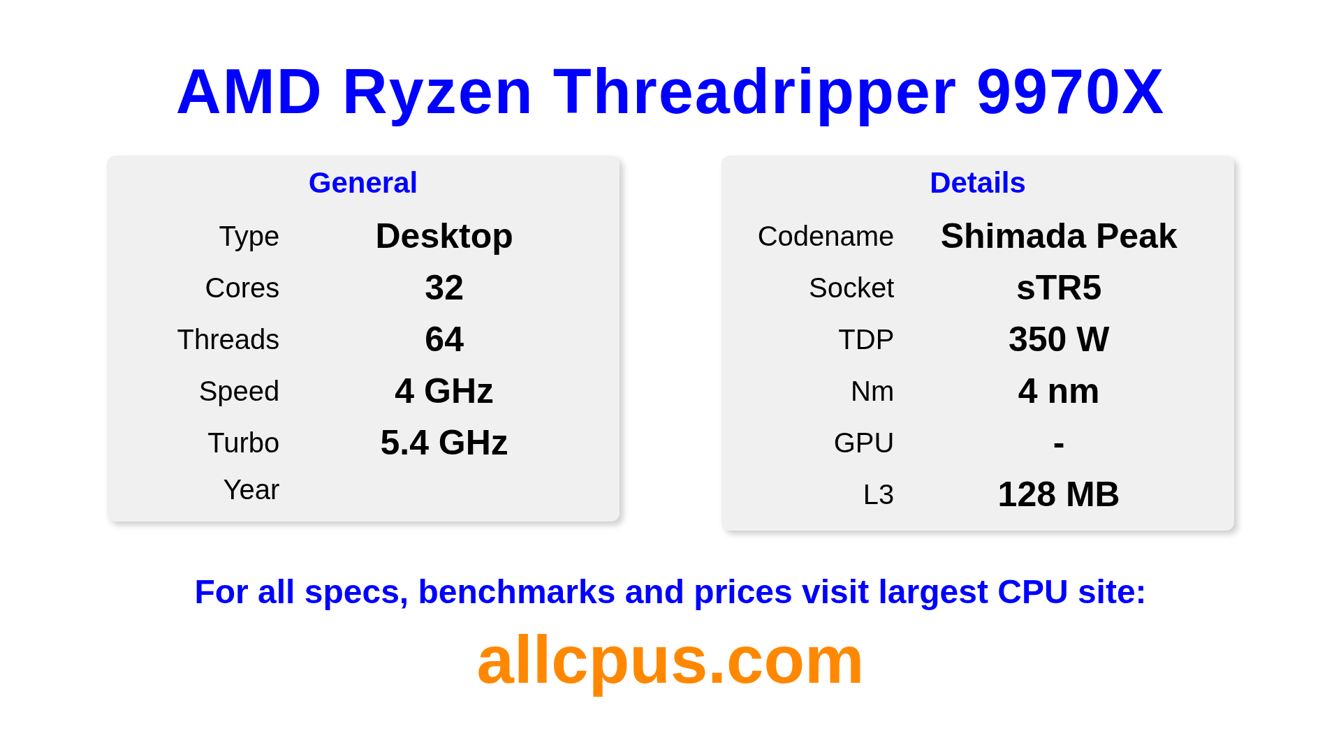 The AMD Ryzen Threadripper 9970X is a AMD desktop processor from the Ryzen Threadripper lineup, built on the Shimada Peak architecture and released in . This CPU features 32 cores, a base clock of 4000 MHz, maximum turbo frequency of 5400 MHz and 128 MB of L3 cache. Manufactured using 4 nm process technology. The AMD Ryzen Threadripper 9970X is designed for the sTR5 socket.It supports overclocking. A dedicated graphics card is required.