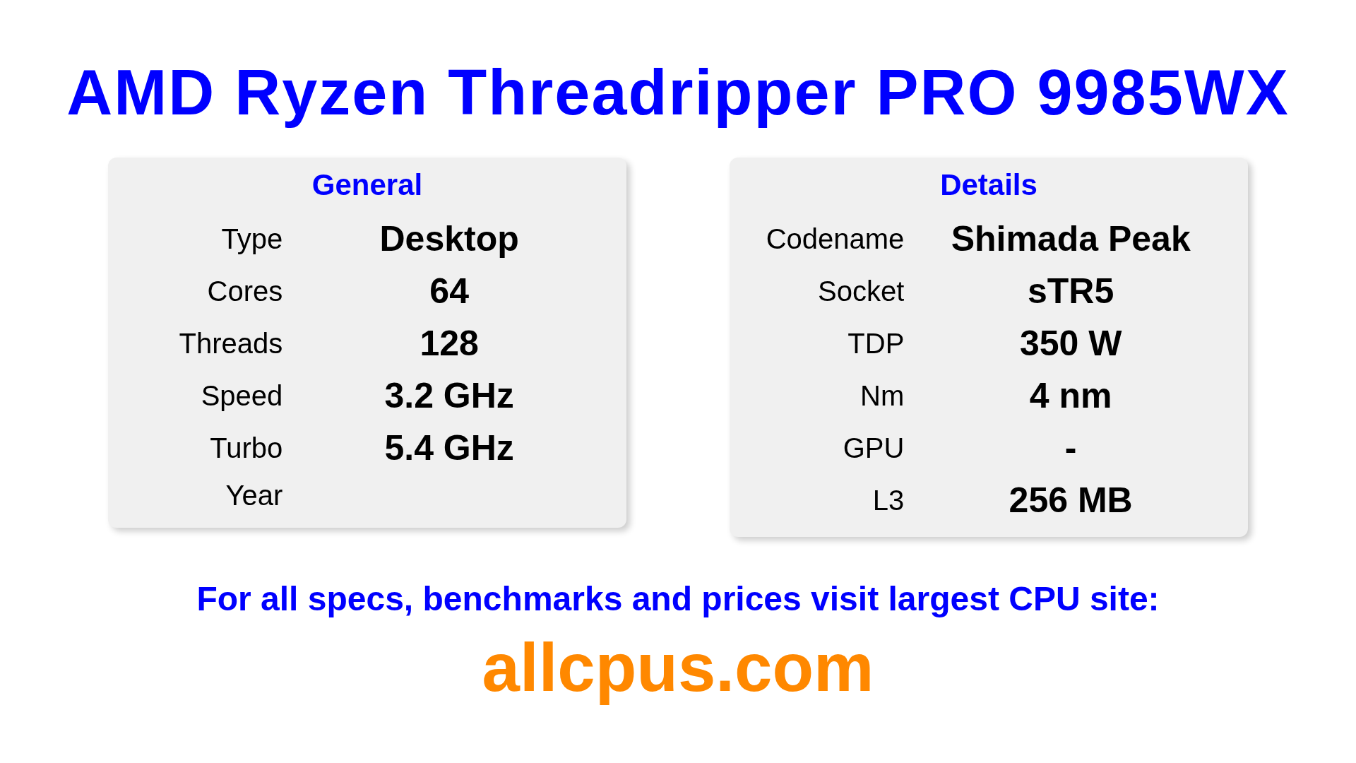 The AMD Ryzen Threadripper PRO 9985WX is a AMD desktop processor from the Ryzen Threadripper PRO lineup, built on the Shimada Peak architecture and released in . This CPU features 64 cores, a base clock of 3200 MHz, maximum turbo frequency of 5400 MHz and 256 MB of L3 cache. Manufactured using 4 nm process technology. The AMD Ryzen Threadripper PRO 9985WX is designed for the sTR5 socket.It supports overclocking. A dedicated graphics card is required.