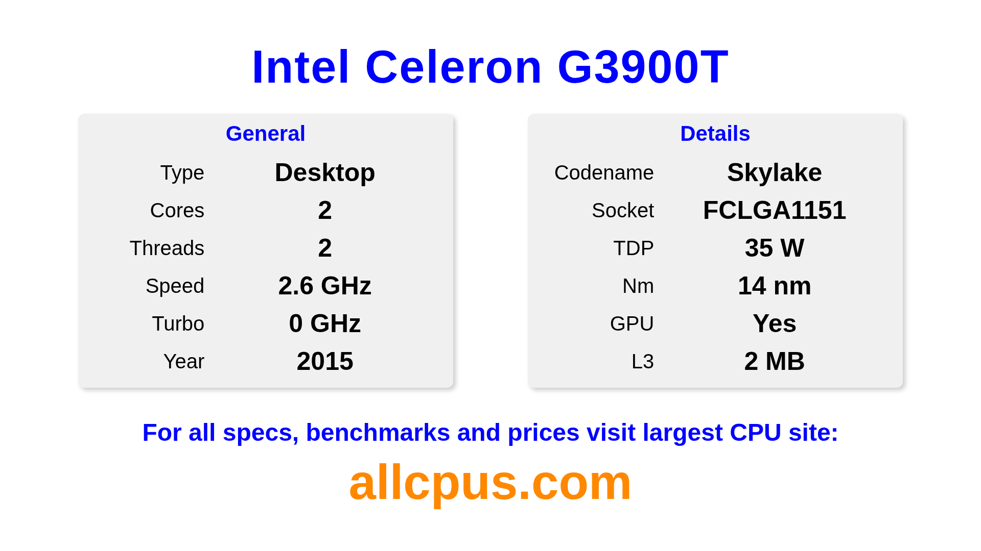 The Intel Celeron G3900T is a Intel desktop processor from the Intel® Celeron® lineup, built on the Skylake architecture and released in 2015. This CPU features 2 cores, a base clock of 2600 MHz, maximum turbo frequency of 0 MHz and 2 MB of L3 cache. Manufactured using 14 nm process technology. The Intel Celeron G3900T is designed for the LGA1151 socket. It includes integrated Intel® HD Graphics 510 graphics.