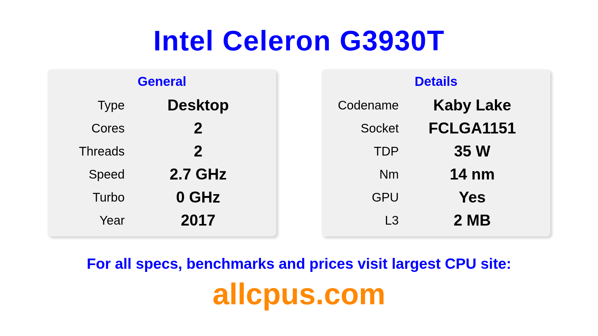 The Intel Celeron G3930T is a Intel desktop processor from the Intel® Celeron® lineup, built on the Kaby Lake architecture and released in 2017. This CPU features 2 cores, a base clock of 2700 MHz, maximum turbo frequency of 0 MHz and 2 MB of L3 cache. Manufactured using 14 nm process technology. The Intel Celeron G3930T is designed for the LGA1151 socket. It includes integrated Intel® HD Graphics 610 graphics.