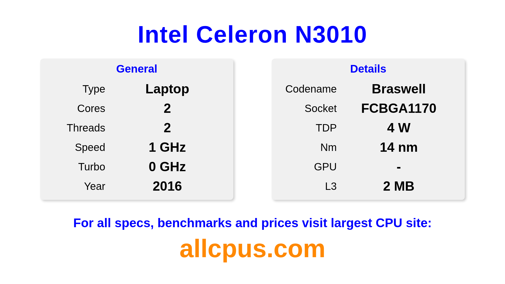 The Intel Celeron N3010 is a Intel laptop processor from the Intel® Celeron® lineup, built on the Braswell architecture and released in 2016. This CPU features 2 cores, a base clock of 1040 MHz, maximum turbo frequency of 0 MHz and 2 MB of L3 cache. Manufactured using 14 nm process technology. The Intel Celeron N3010 is designed for the BGA1170 socket. A dedicated graphics card is required.