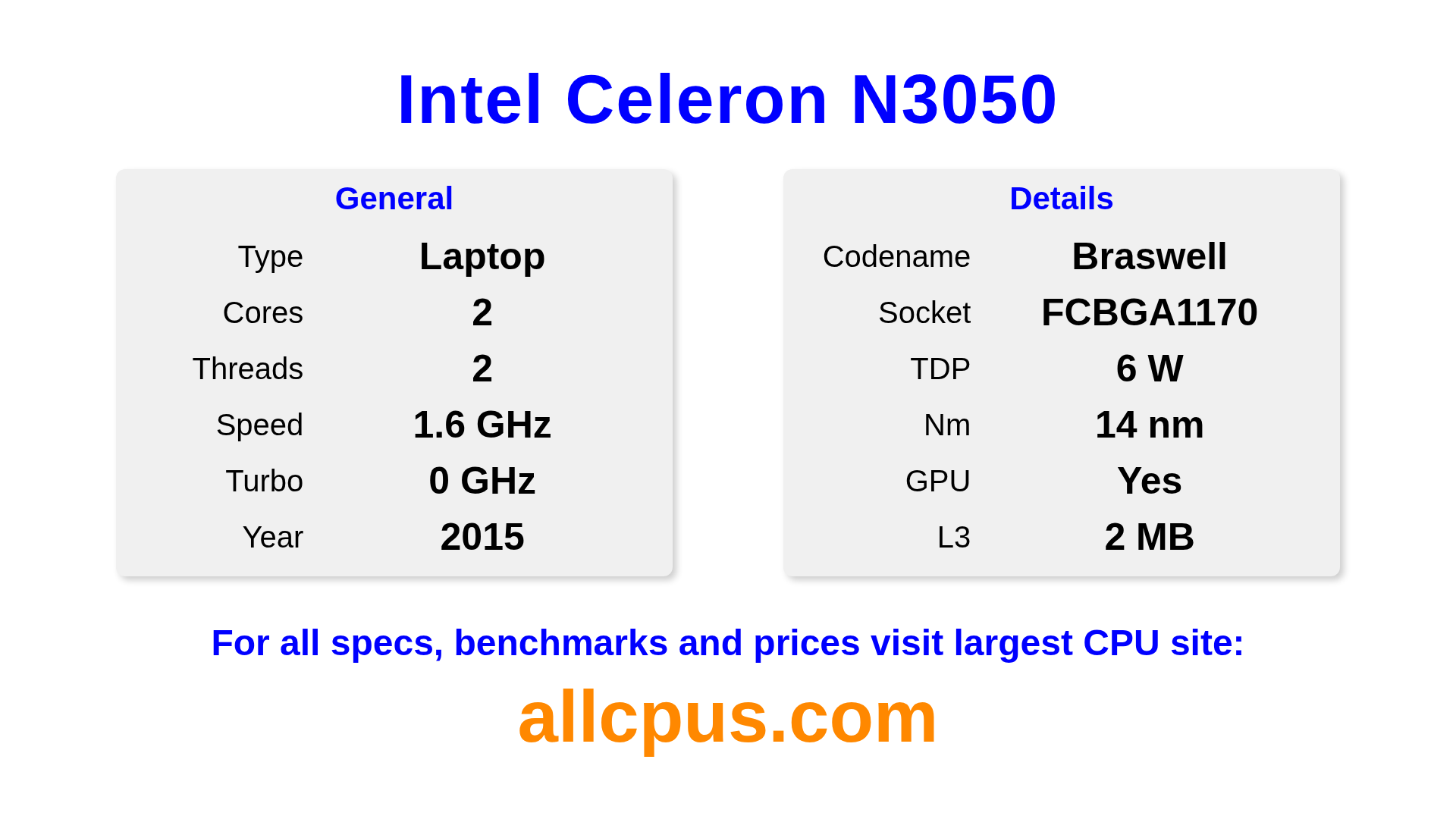 The Intel Celeron N3050 is a Intel laptop processor from the Intel® Celeron® lineup, built on the Braswell architecture and released in 2015. This CPU features 2 cores, a base clock of 1600 MHz, maximum turbo frequency of 0 MHz and 2 MB of L3 cache. Manufactured using 14 nm process technology. The Intel Celeron N3050 is designed for the BGA1170 socket. It includes integrated Intel® HD Graphics for Intel® Celeron® Processor N3000 Series graphics.