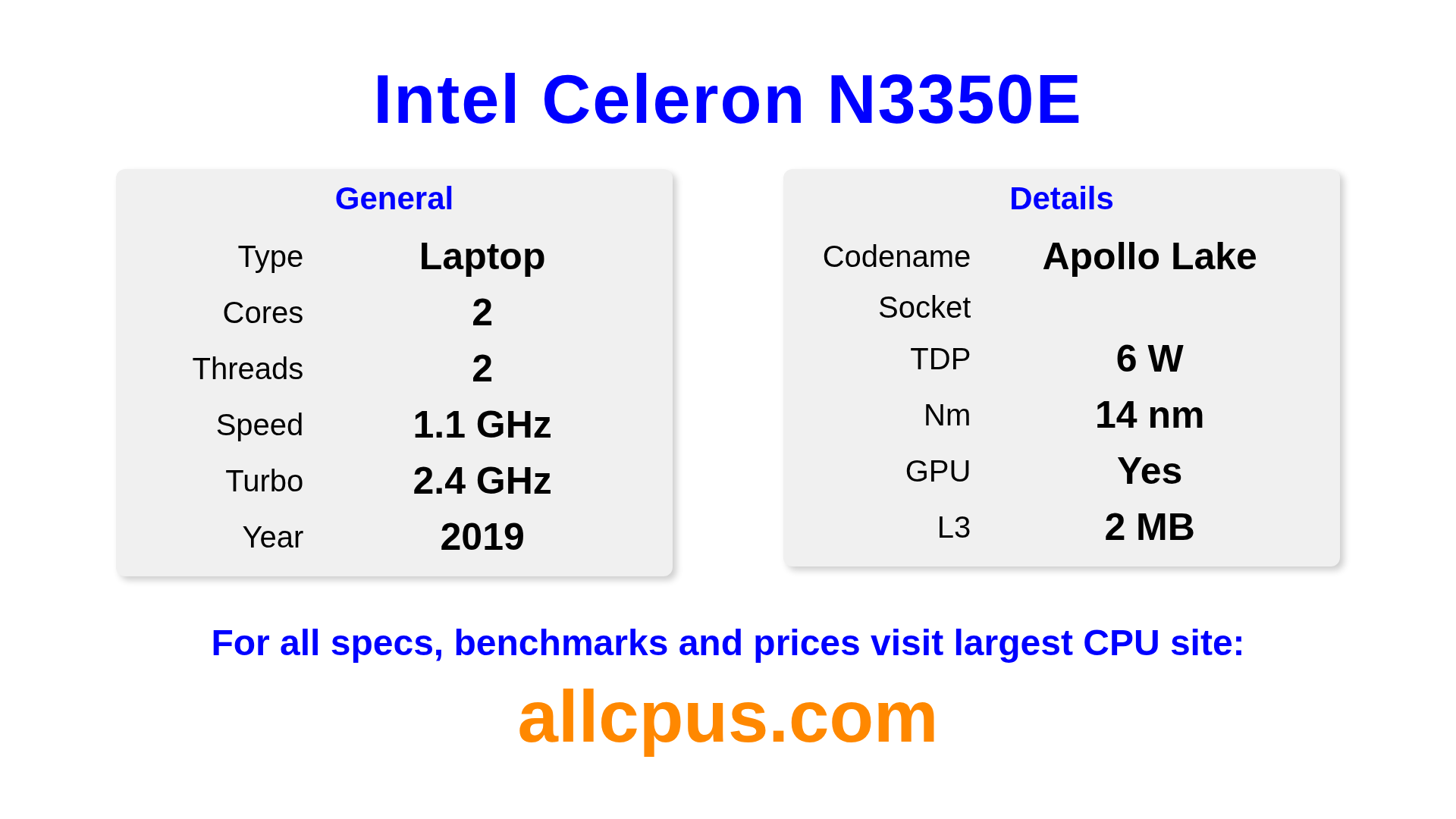 The Intel Celeron N3350E is a Intel laptop processor from the Intel® Celeron® lineup, built on the Apollo Lake architecture and released in 2019. This CPU features 2 cores, a base clock of 1100 MHz, maximum turbo frequency of 2400 MHz and 2 MB of L3 cache. Manufactured using 14 nm process technology. The Intel Celeron N3350E is designed for the socket. It includes integrated Intel® HD Graphics 500 graphics.