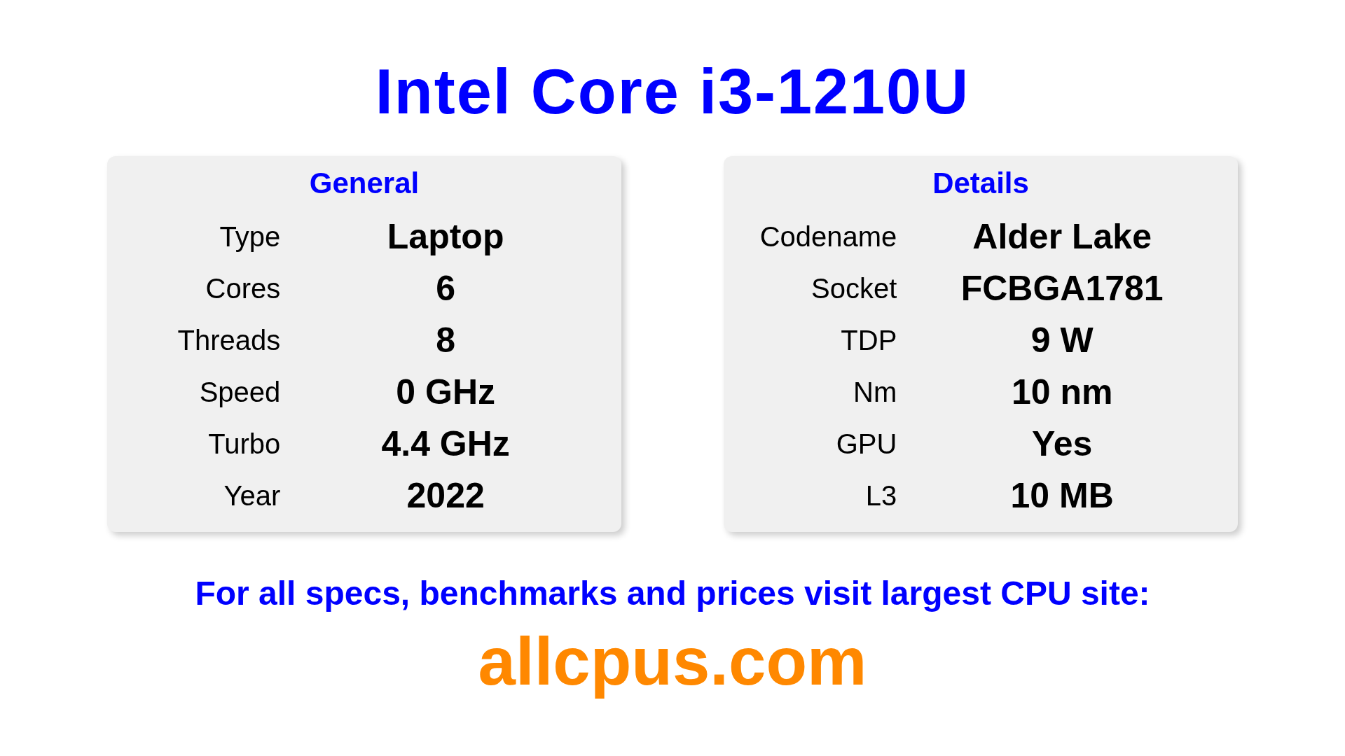 The Intel Core i3-1210U is a Intel laptop processor from the Intel Core lineup, built on the Alder Lake architecture and released in 2022. This CPU features 6 cores, a base clock of 0 MHz, maximum turbo frequency of 4400 MHz and 10 MB of L3 cache. Manufactured using 10 nm process technology. The Intel Core i3-1210U is designed for the BGA1781 socket. It includes integrated Intel® UHD Graphics for 12th Gen Intel® Processors graphics.