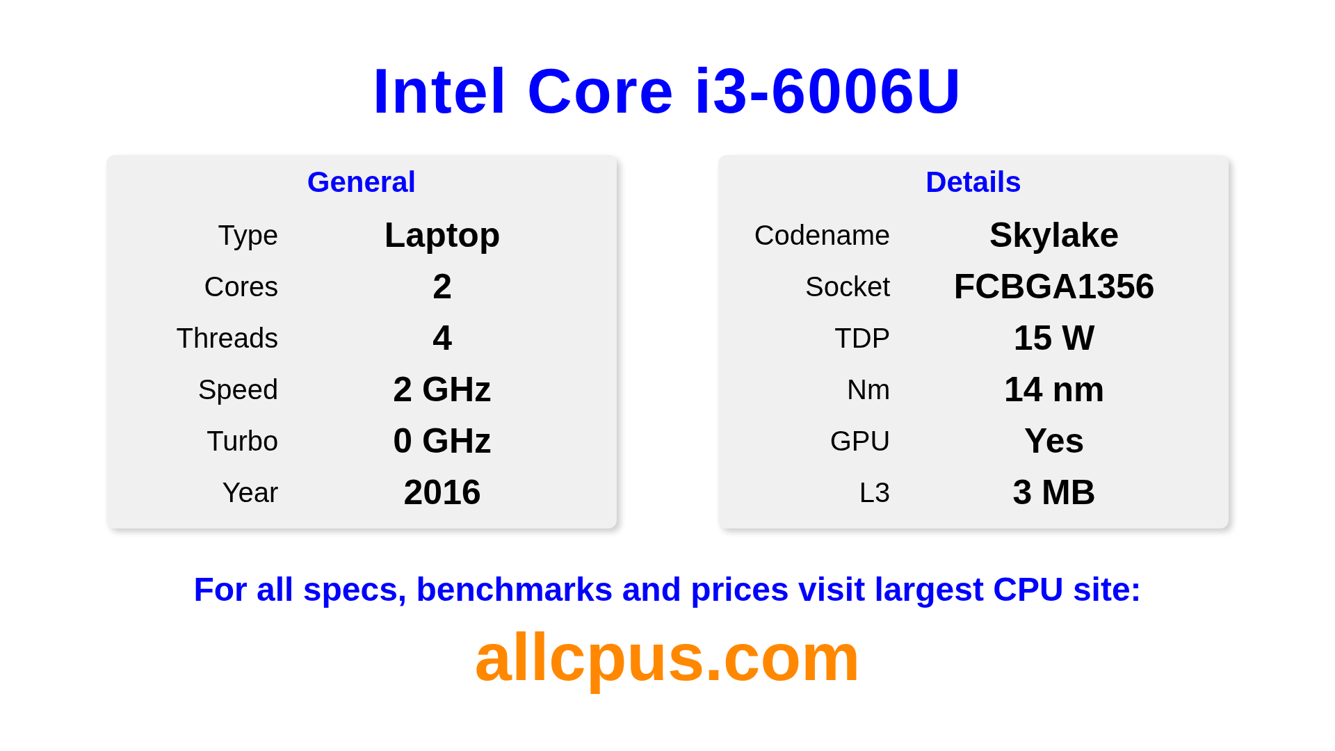 The Intel Core i3-6006U is a Intel laptop processor from the Intel Core lineup, built on the Skylake architecture and released in 2016. This CPU features 2 cores, a base clock of 2000 MHz, maximum turbo frequency of 0 MHz and 3 MB of L3 cache. Manufactured using 14 nm process technology. The Intel Core i3-6006U is designed for the BGA1356 socket. It includes integrated Intel® HD Graphics 520 graphics.